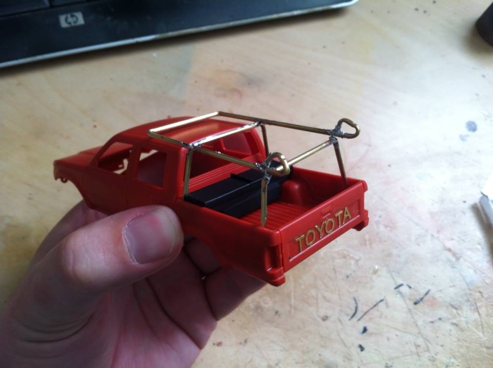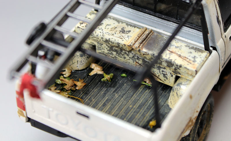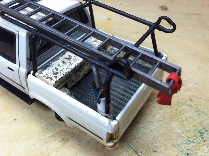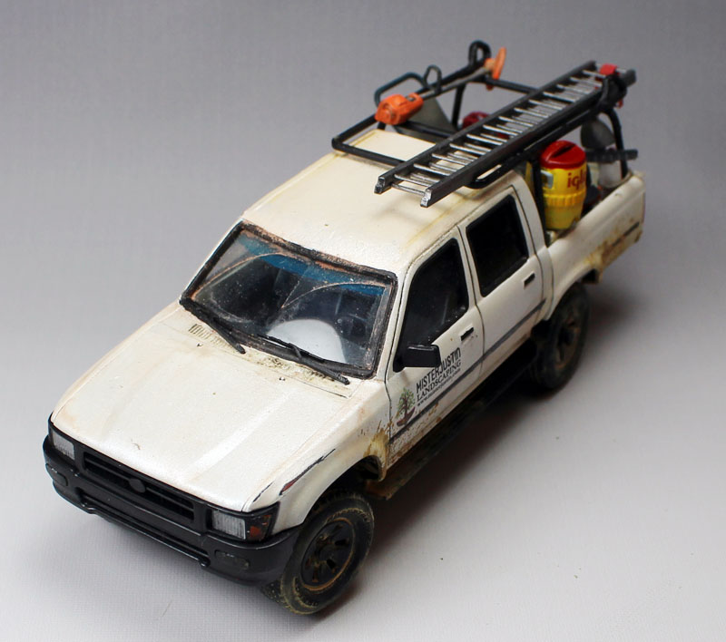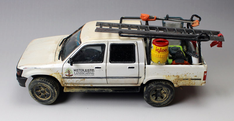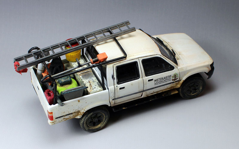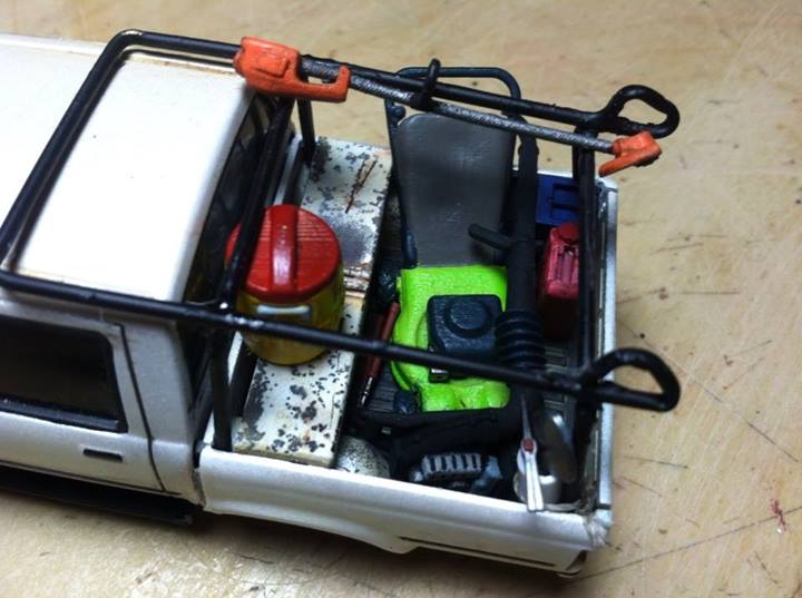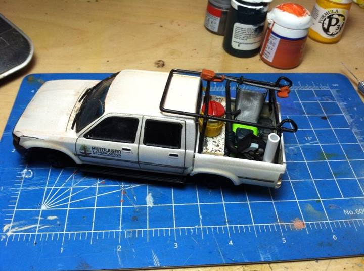 First up is my Landscaping truck. This is the Toyota kit from Meng, and I've scratch built the rack, added the TOYOTA brass, scratch built the tool bin, and had some tools 3D printed so I can pimp this thing out properly.