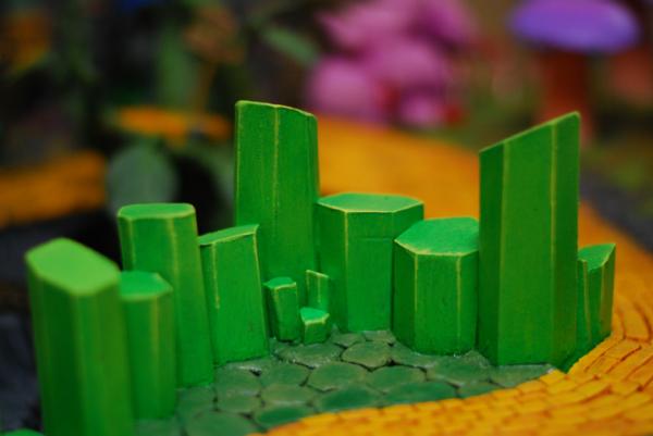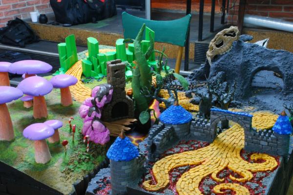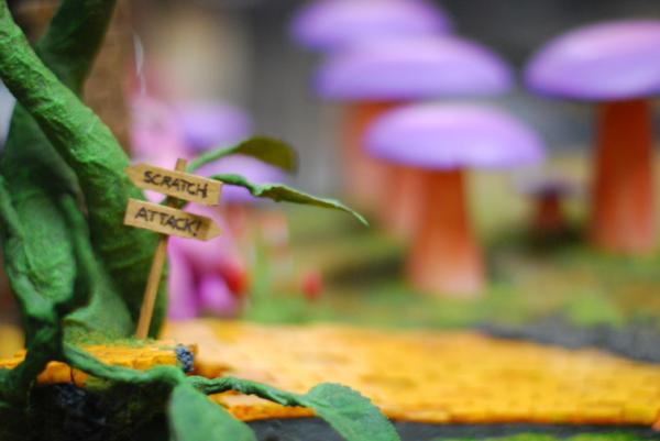 Te original idea for the table was to create two sides, a happy side as to say, and a darker, creepier one. So we decided to make a giant beanstalk in the middle of the table, and make it the highest point of it, and as if it would have parted the land in two, therefore creating the two different sides.