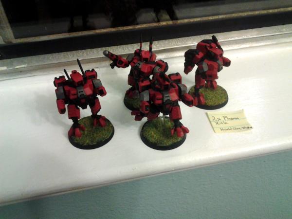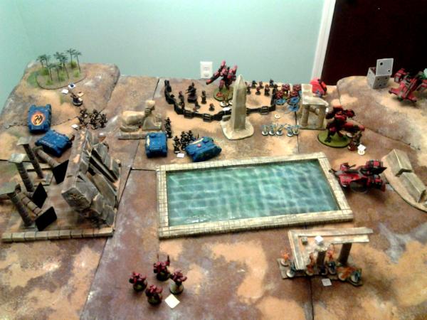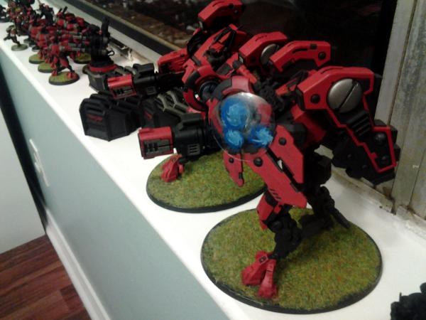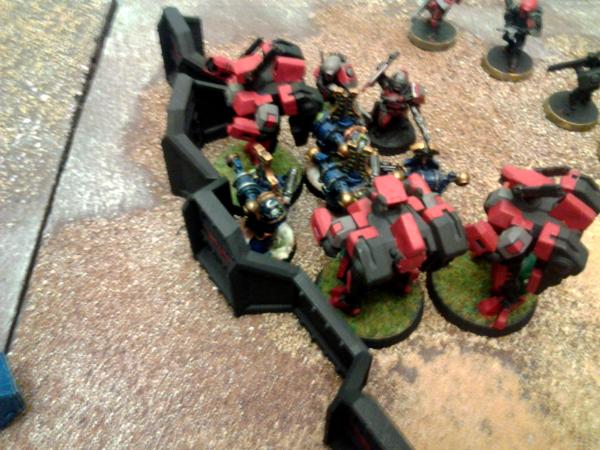-Devilfish cruises and fires on Flamers. Farsight deepstrikes behind the Predator with his team and blows up the tank. Fire Warriors take down four Marines while Fireblade nicks a rhino. Riptides are locked in combat and squish one enemy each. Crisis team kills five screamers and stays locked in combat. Longstrike uses the submunitions and kills some Marines. Crisis suits jet pack away from spawn.