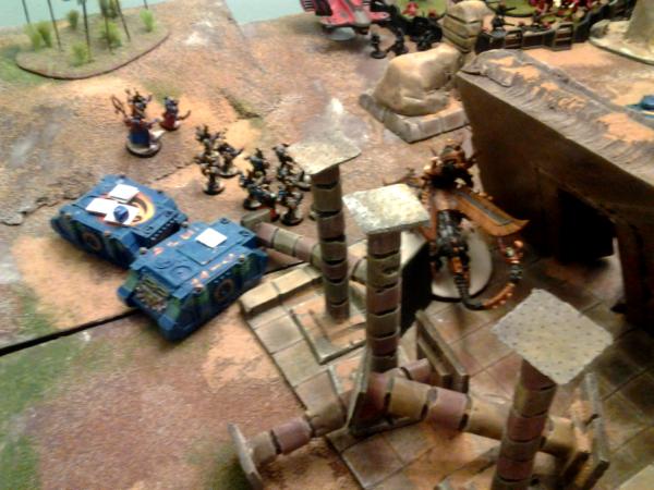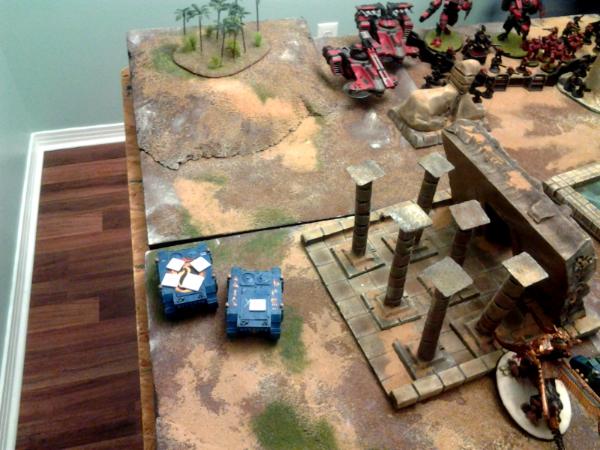 -Longstrike fails yet again to kill a rhino. Farsight barely misses Ahriman. Fire warriors have their fire dink off of a rhino. Crisis team charges to help Fire Warrors and takes a Marine. Devilfish does a wound to Astraeos. Riptide Hits a Rhino for two hull points. Farsight jetpacks away into cover.