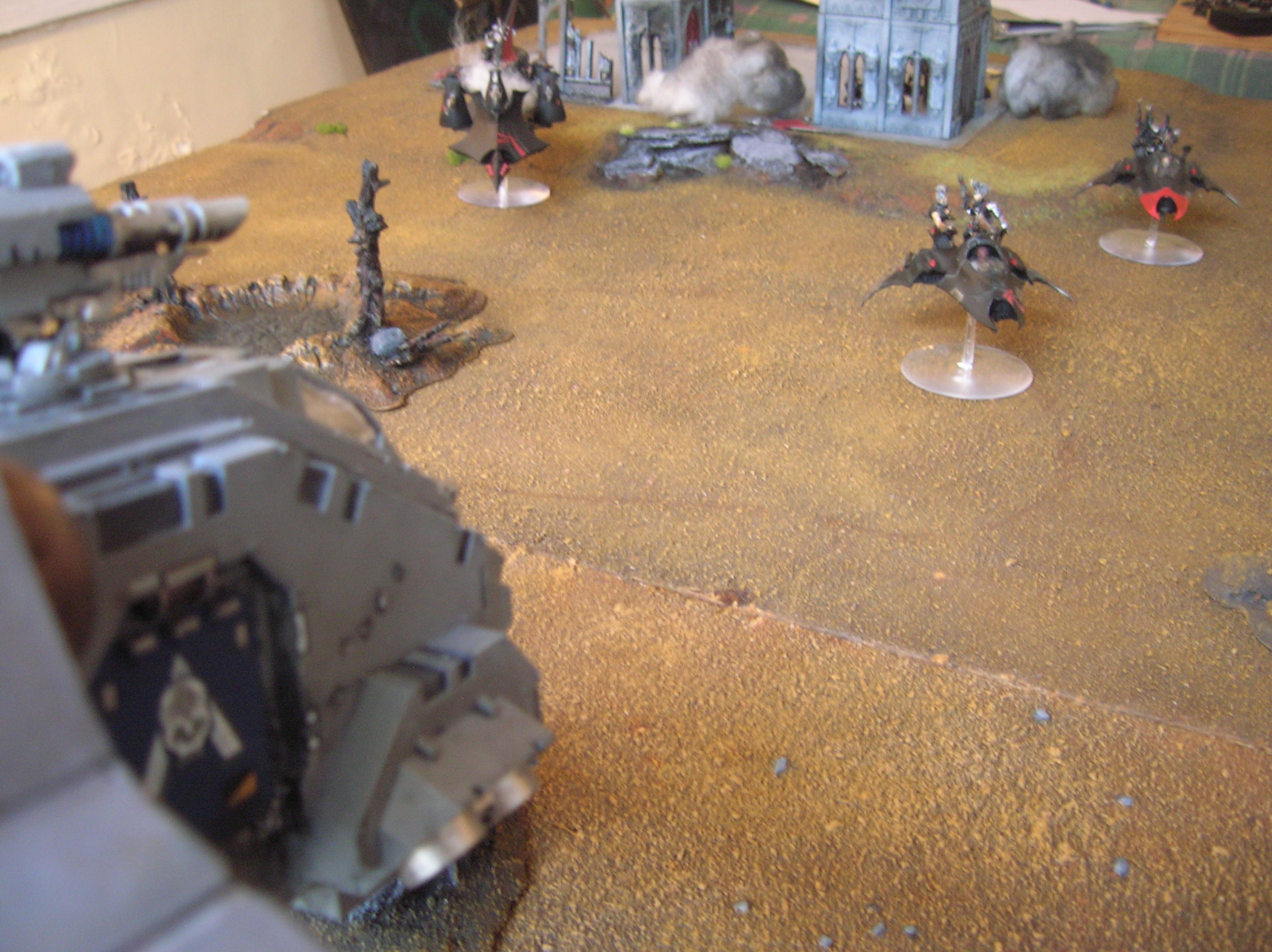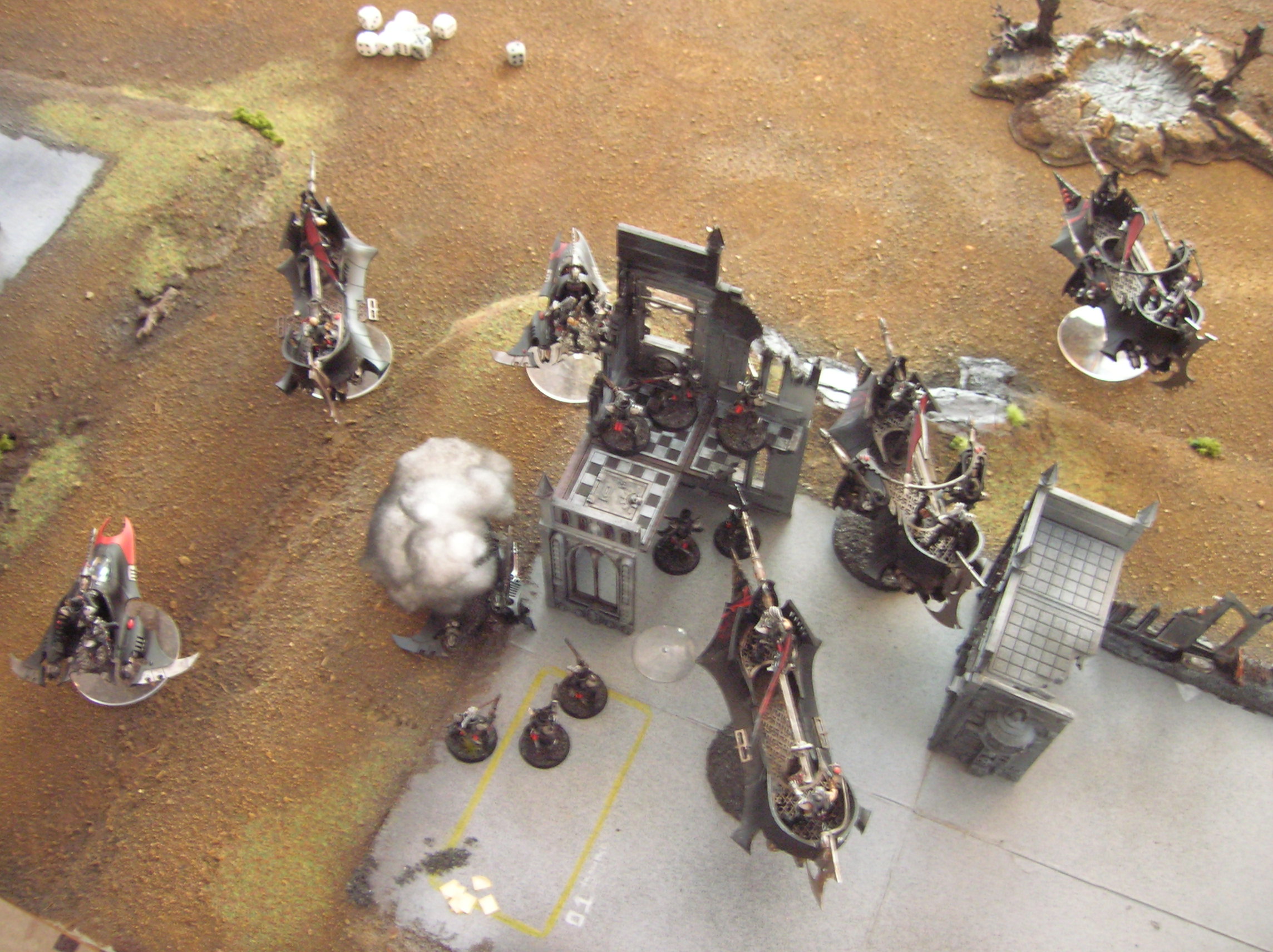 Dark Eldar deploy in the ruins and out of range of the Vindicator. They immediately drop a venom squad on the objective, knowing that they are safer in the ruins than in the armour 10 attack craft. Nothing has been left in reserve