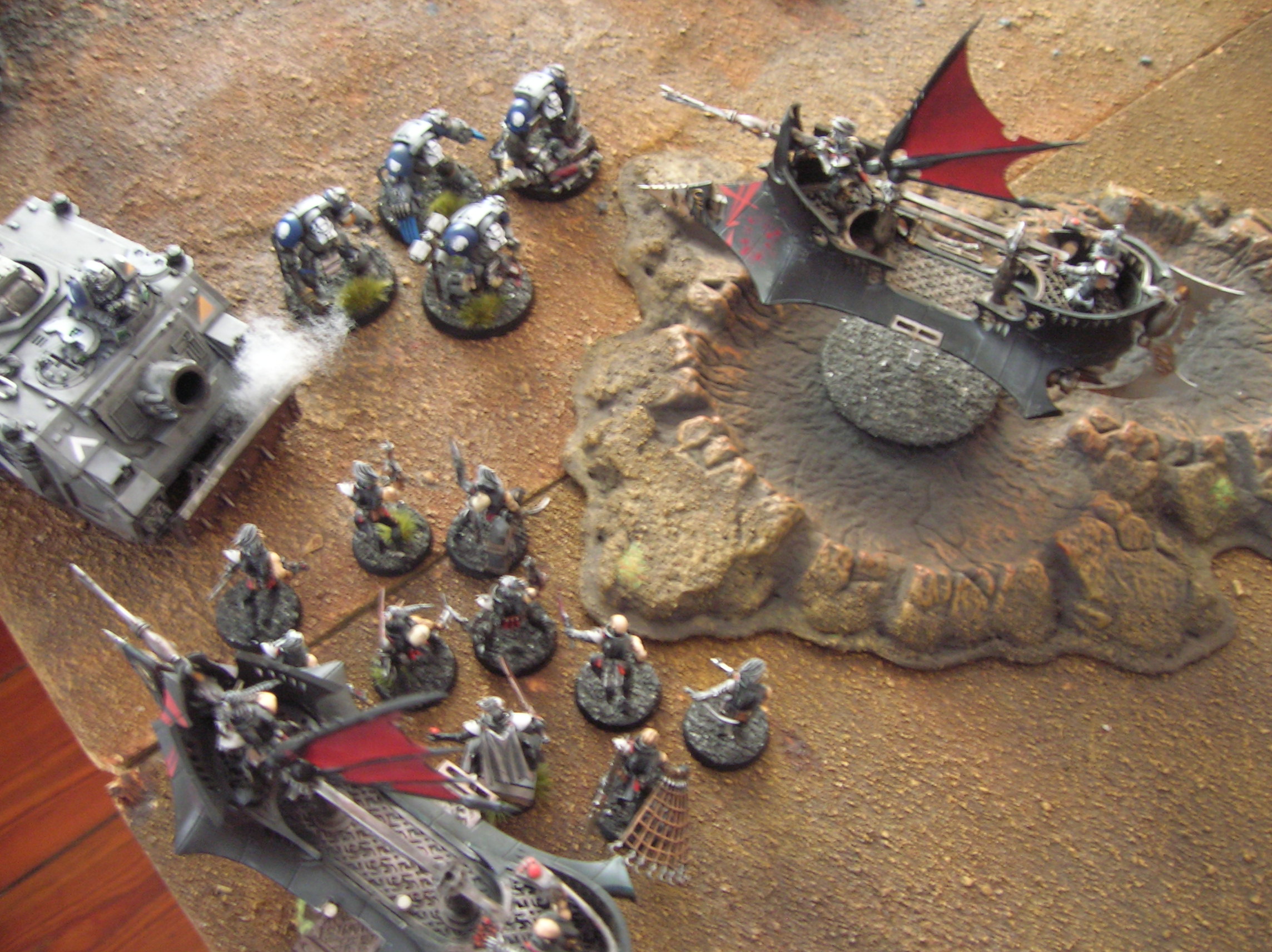 Hello all. Thought I would share my first attempt at a Battle Report. Small, "non-competitive" lists. Just wanted to take some pics and as Gee dub says, forge that sweet ass narrative. PS. the pics are not great. Codex; Space Marines vs. Codex; Dark Eldar. 1150 (I know its a random number but its what we had painted) On the dusty, arid planes of a former Imperial agri-world, forces of the Adeptus Astartes Imperial Specters chapter engage Eldar Pirates belonging to the Kabal of the Shrouded Dagger. Marines. Librarian (rites of war, psychic shriek) 10 Tactical Marines (missile launcher, flamer, power fist, rhino) 5 Tactical Marines (lascannon, razorback with twin linked lascannon) 5 Assault Marines (flamer, thunder hammer) 5 Assault Terminators (4 thunderhammer and storm shield) Stormraven Gunship Vindicator Dark Eldar. Combat Drugs: Painbringer (reroll wounds) Archon (shadow field, combat drugs, agonizer, inspiring presence) 5 Warriors (sybarite, agonizer, blaster, venom dual splinter cannon) 5 Warriors (blaster, venom dual splinter cannon) 5 Wyches (venom, dual splinter cannon, haywire grenades 9 Wyches (hekatrix, agonizer, raider, haywire grenades) 10 Wyches (hekatrix, agonizer, raider, haywire grenades) Ravager (3 dark lances) Ravager (3 disintegrator cannons) Ok, If I knew how to put pictures in other than as attachments I would just do this all at once. But because I am semi computer illiterate I am just going to post these one at a time.