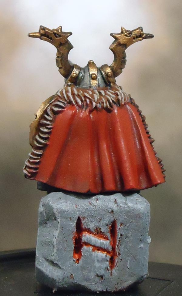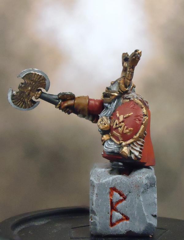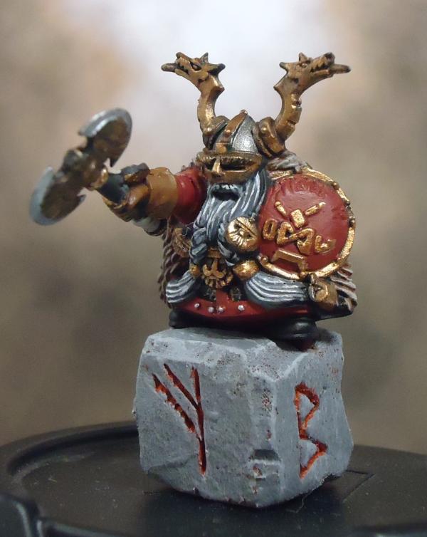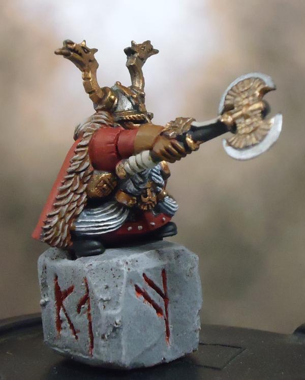 Its funny, I noticed those when I painted it and just thought they were scratches that had been picked up sitting in a box of minis waiting to be painted for 6 years. I figured if they were runes they would be raised like the anvil on the shield, not engraved. Looking at some other pics of this mini online though I can see they are indeed runes. I will go back and give the shield a wash and some highlights, see how that goes. Thanks for the advice!