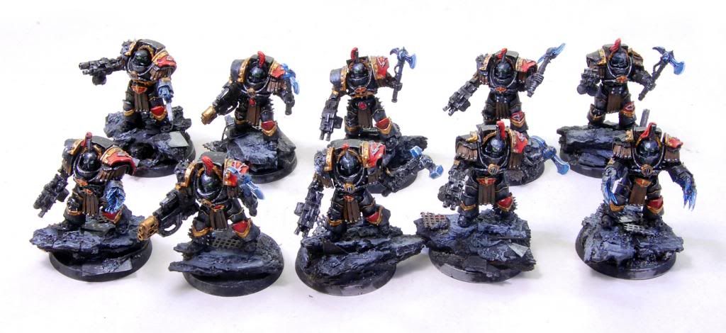 DarkSoldier wrote:When weathering, focus on high-traffic areas, places that would receive mud and dust, scrape against stuff, and the crew would frequently grab/walk on. The flat sides of the Malcador, for example, wouldn't get as much wear as handles, hinges, and the leading edges of the tread assemblies. I try to do that, to an extent, placing more weathering on exposed areas like handles and around the tracks. Scratches on flat sides of the tank may be caused by deflected and direct bullet hits, close combat weapons scratching the surface, debris flying from explosions, vehicle moving through difficult terrain like walls and buildings and extreme weather like hurricanes and tornadoes throwing rocks at high speed agains them. My Heresy army is built around Istvaan III campaign, so idea was to make it look like it had spend few weeks/months on post virus bombing planet, with its firestorms, hurricanes and scorched cityscape full of obstacles and devious loyalist traps thank you! Automatically Appended Next Post: Finished my 50th Heresy style Terminator, so here they are together, Pride of the Legions and bodyguards for Primarch, 2+ power!