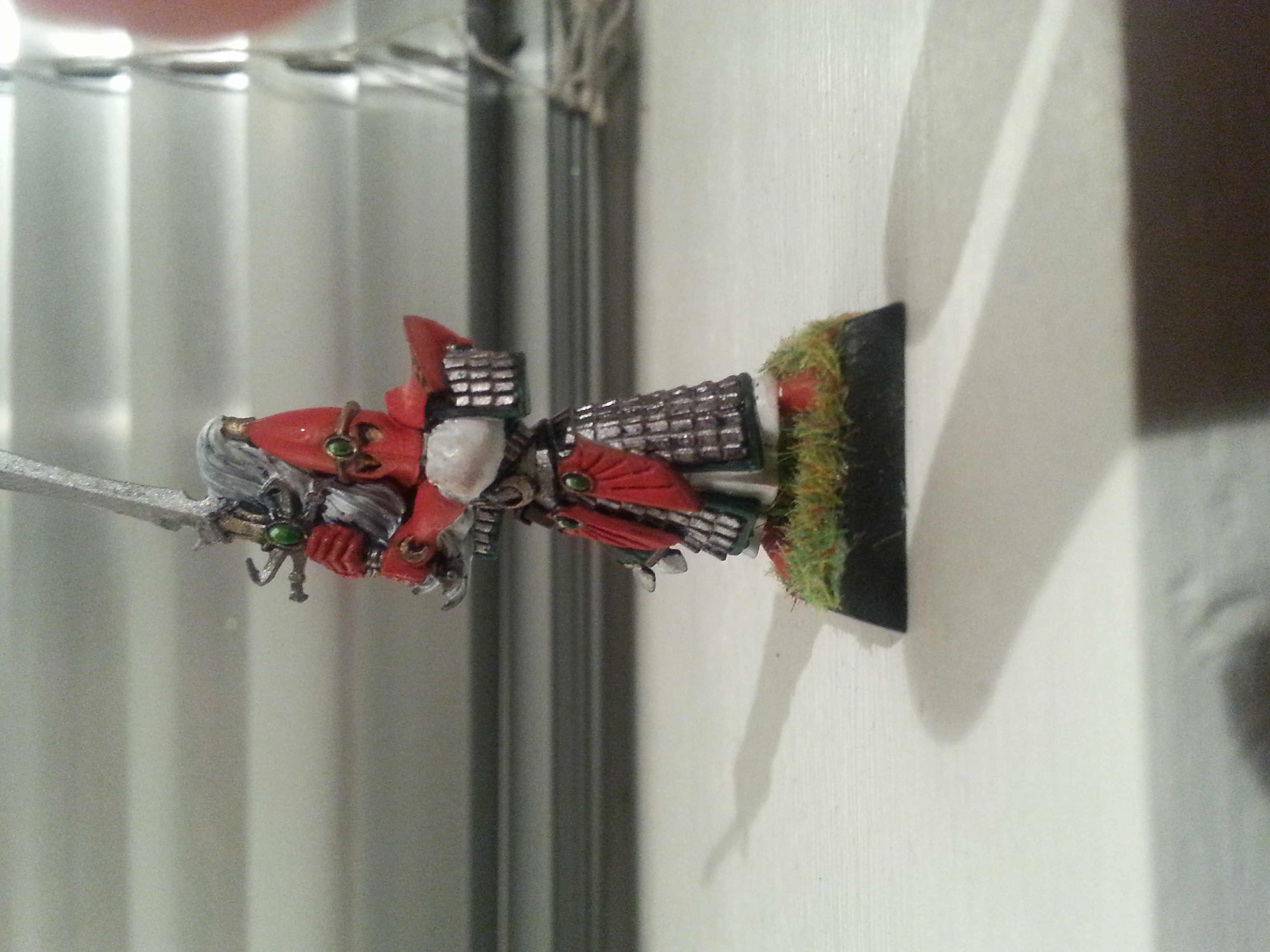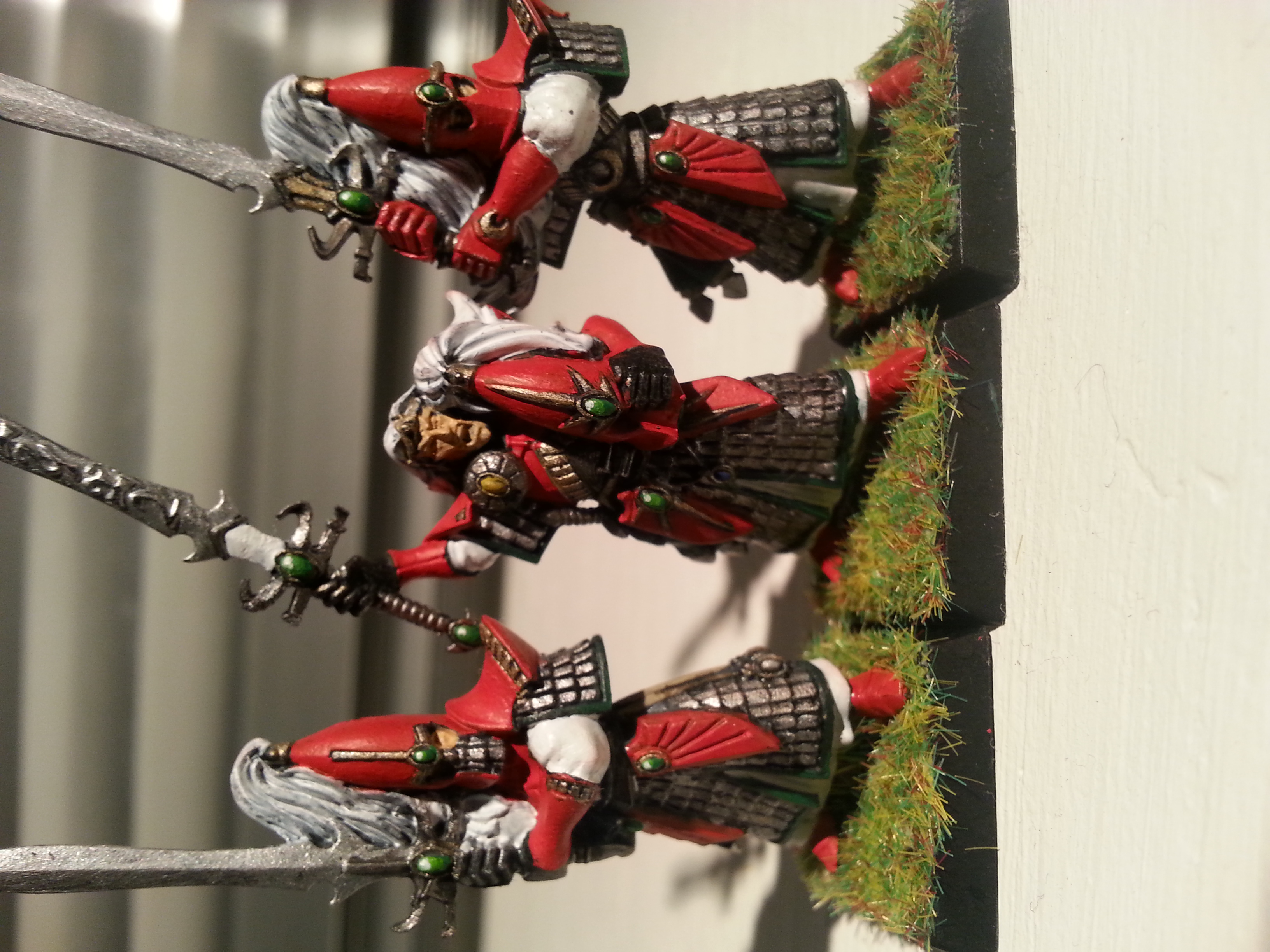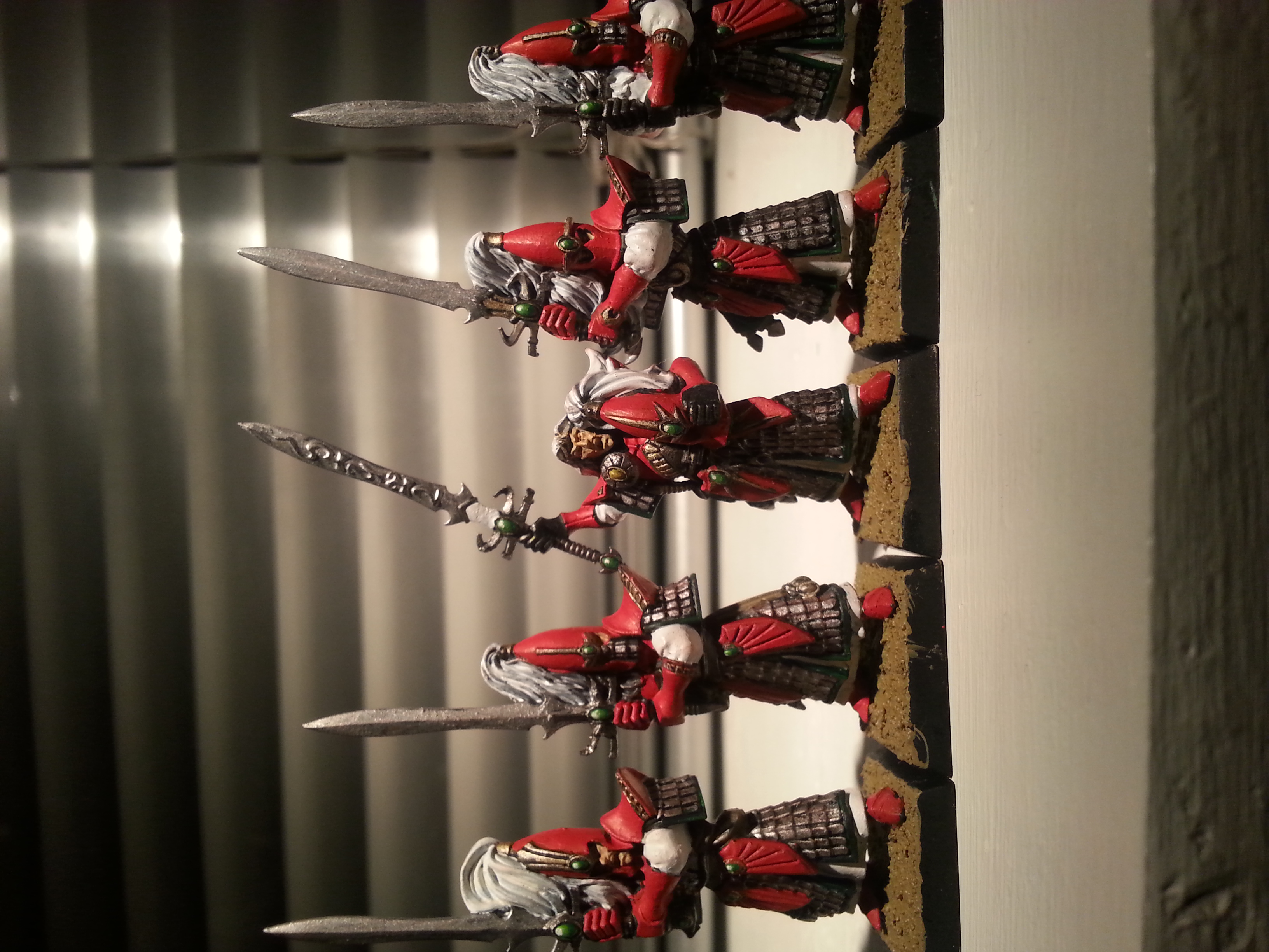 What i havent done yet are parts that im unsure about. The picture is taken a bit wrong and much of the color doesent show because of shadows. The hair on the helmet could have blue shade to give a white-silvery feel or black to show the details properly. The swords still need some work, and im considering gold on runes on leaders blade and the white part of his blade will be "gem like". Red highlights can make the unit less bland, but if done incorrectly might ruin the smooth/sleek feel of the great bright red color. What im more curious about is if you think i should have bronze shade on the gold to give a bronze feel or if the current gold color would be best. Also should i buy "rocks" or find some outside to have on the ground of my unit?