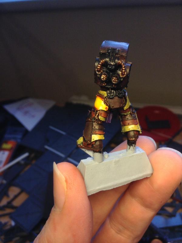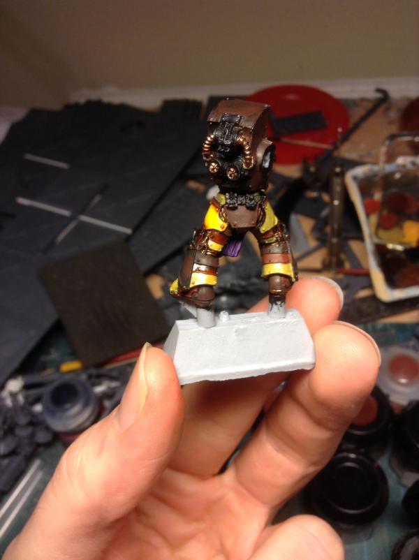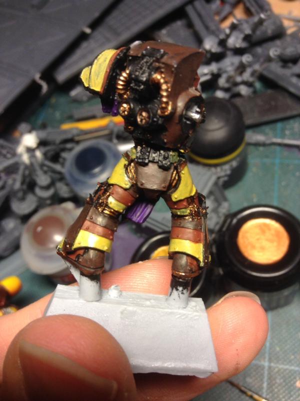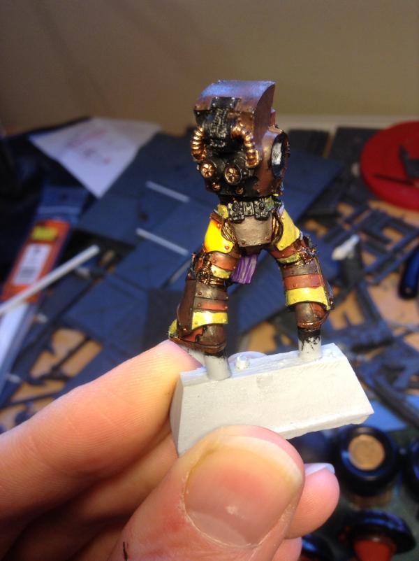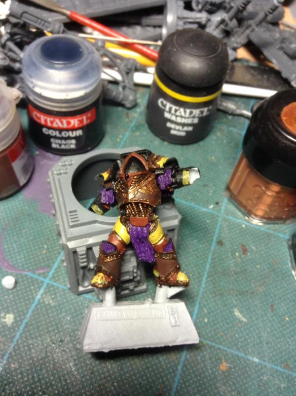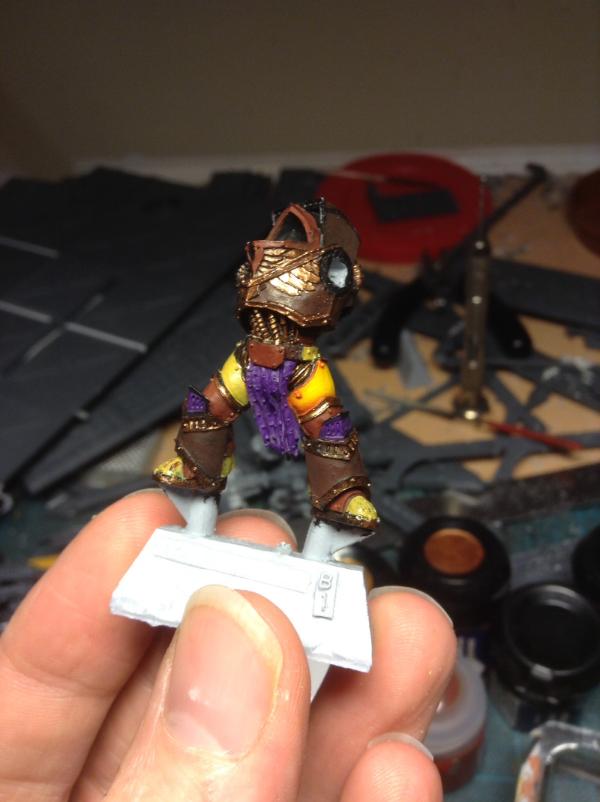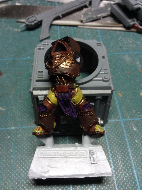 bossfearless wrote:Paint is looking pretty thick on the purple and the yellows. I would try starting with something like a Vomit Brown and then working up to Yellow through successive drybrushes. The gold, on the other hand, is looking quite nice especially on the finished portions (joints, cables). Good job so far, I'm interested to see where this goes.