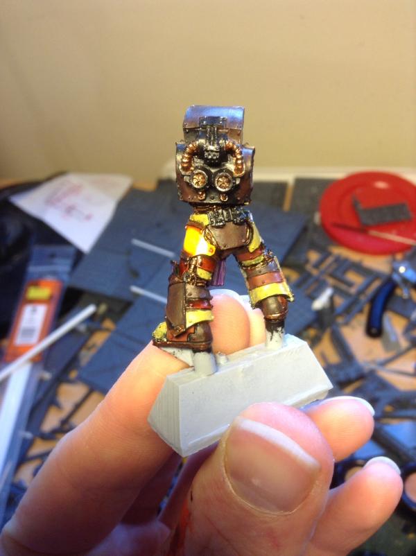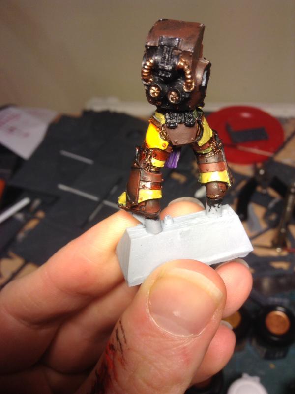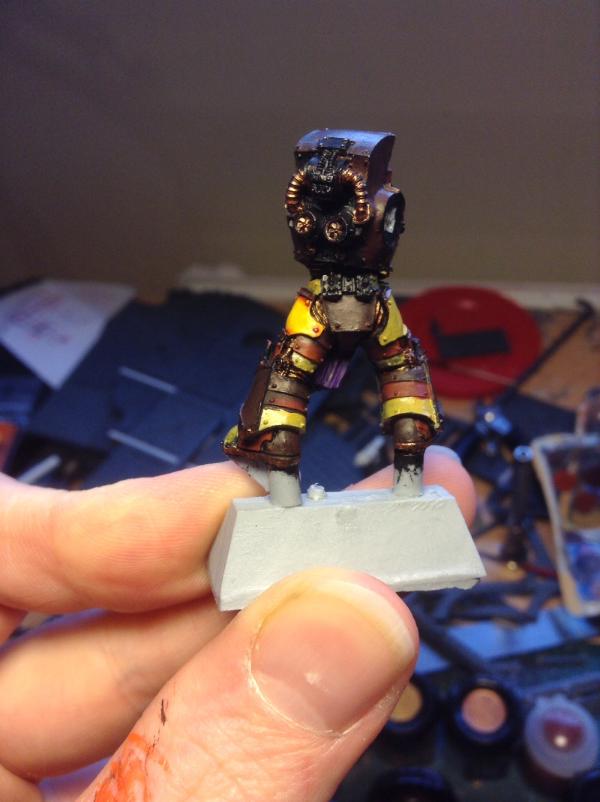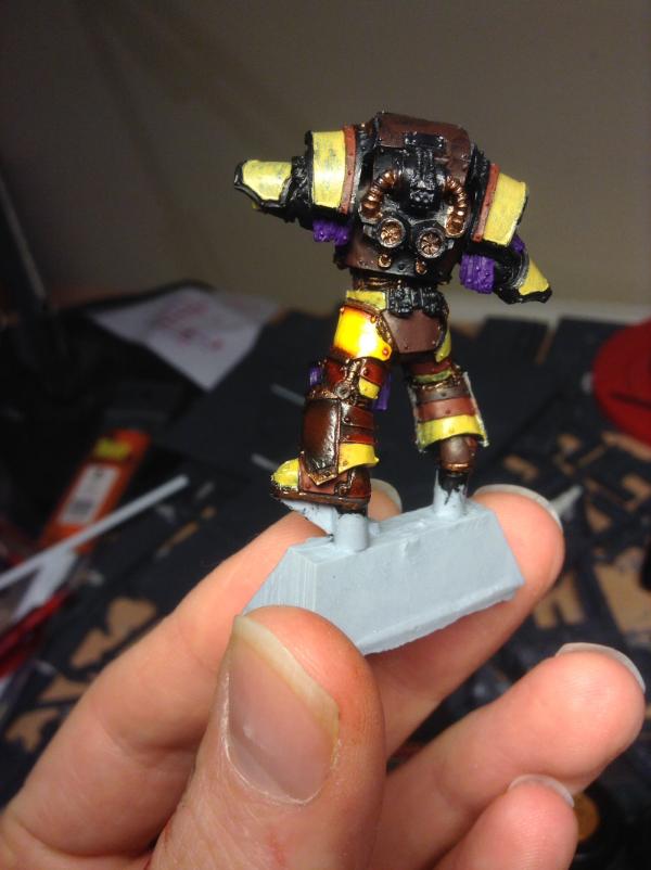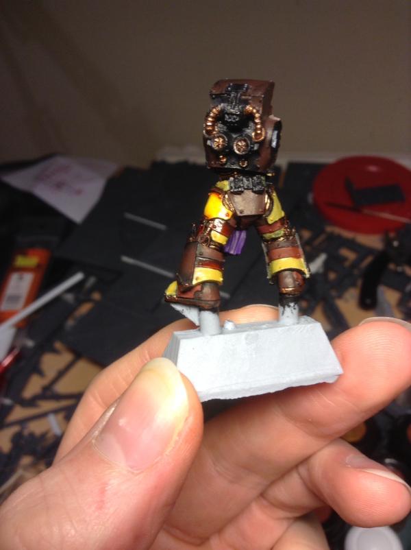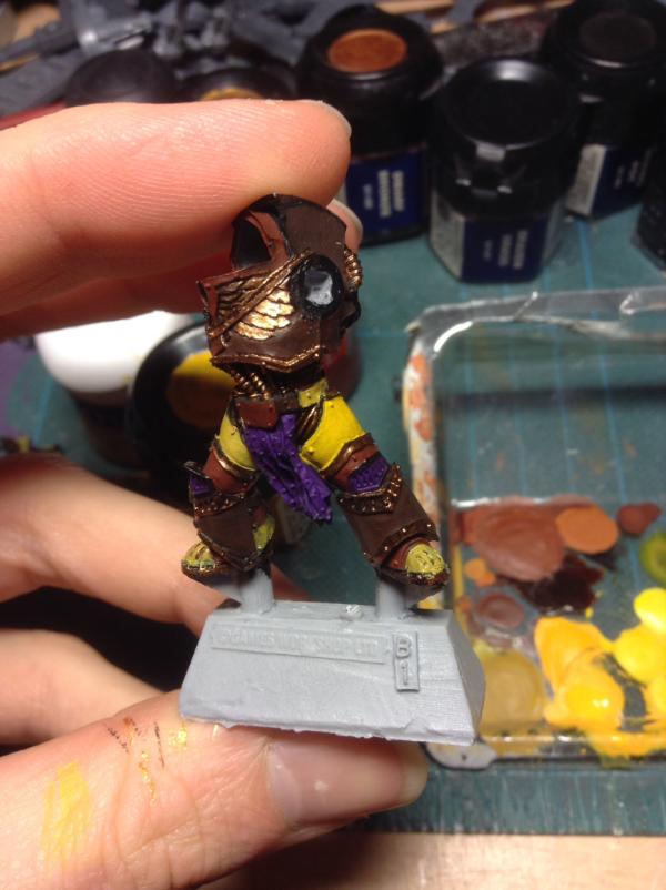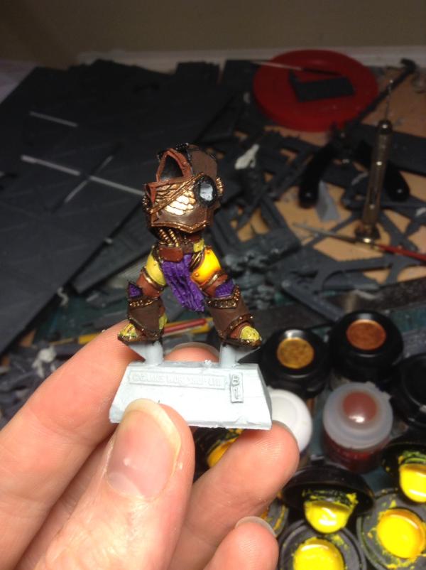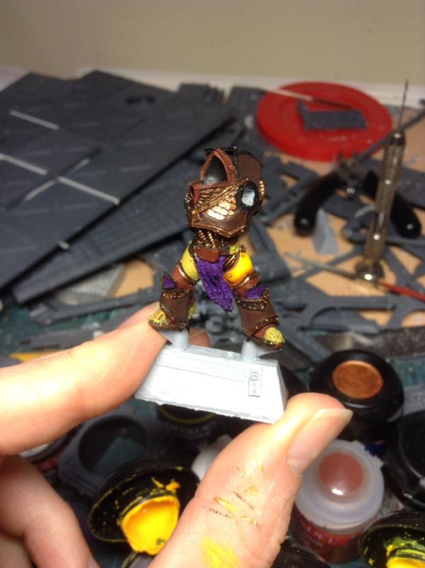 bossfearless wrote:Paint is looking pretty thick on the purple and the yellows. I would try starting with something like a Vomit Brown and then working up to Yellow through successive drybrushes. The gold, on the other hand, is looking quite nice especially on the finished portions (joints, cables). Good job so far, I'm interested to see where this goes.