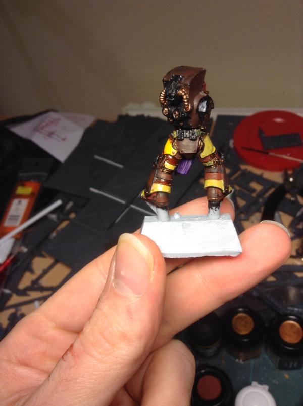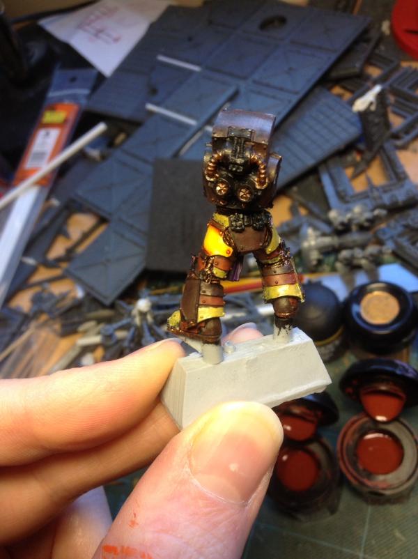 Today's update (so far) - an exercise in brown. Well, a red-ish brown. Funny but it's a great compliment to yellow, but I've never seen another brown colour scheme for marines before. Ah well, each to their own I guess... Anyway, here goes (nb, I started painting a couple of sections up before I remembered I was supposed to be taking pics, so concentrate on the lower leg middle 'band')