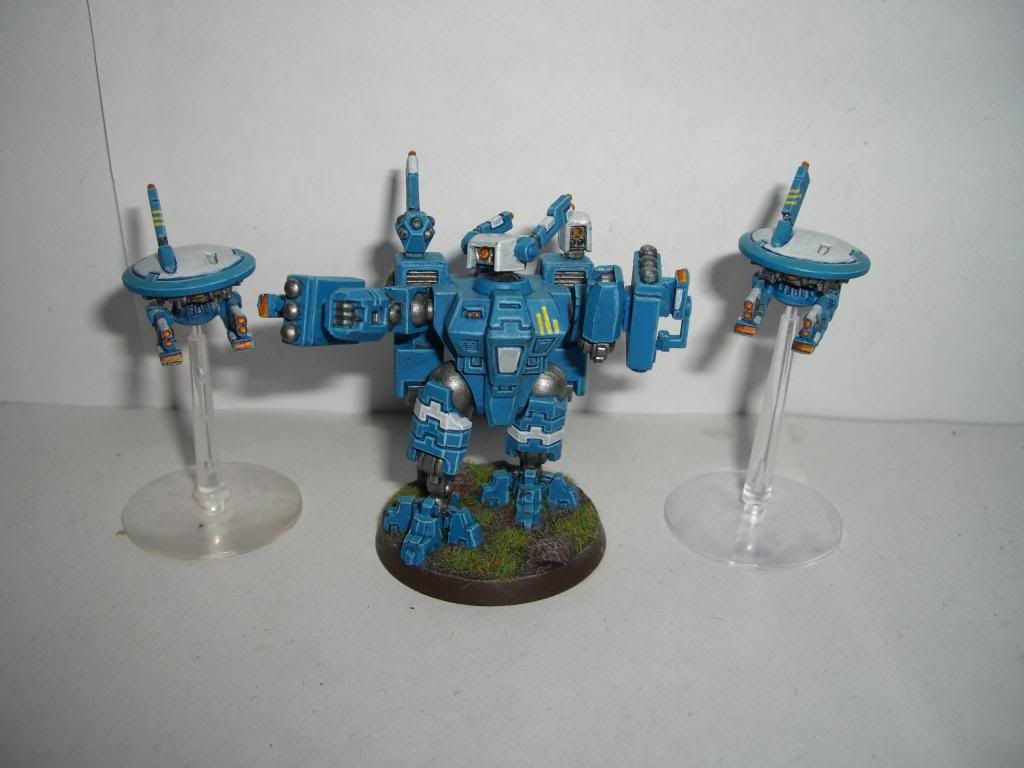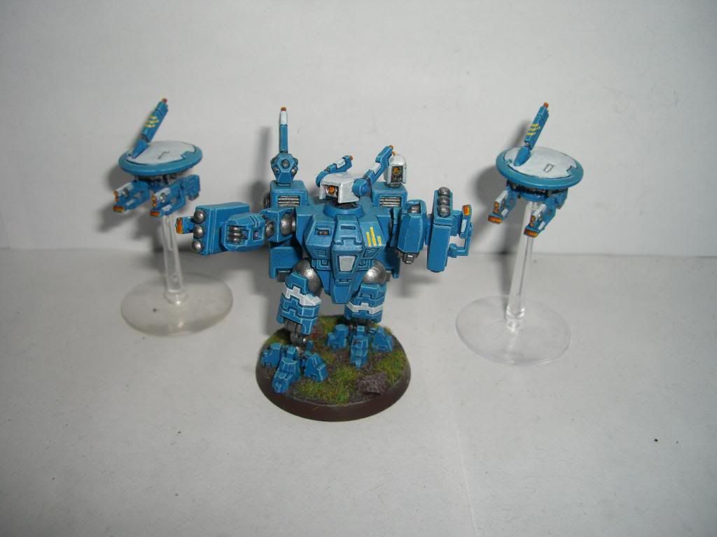 My latest battlesuit towards my tau army, with some sensory things added to his missile pods. This is also my first time painting drones with this colour scheme, I'm not sure about the white on their top plates, but I was quite pleased with the positioning of the yellow stripes on them. Any feedback or C+C is appreciated!