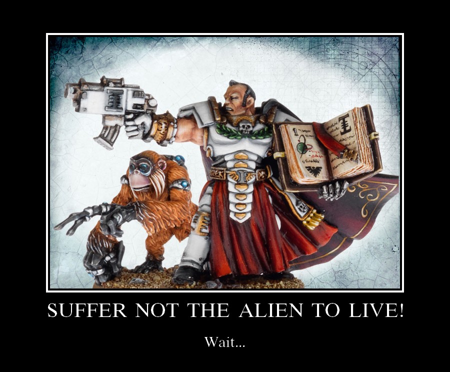 What I would like help with is creating an army list (using either codex grey knights or codex inquisition) which consists predominantly of jokaero, but may contain vehicles and other models. It needs some objective claiming potential, so it needs a unit that can get up close, and some to hang back. It needs to not instantly evaporate when the enemy returns fire, which could be accomplished with bullet catchers (acolytes) or crusaders for better invulnerable saves. Any non-jokaero will be proxied with other forms of converted space monkeys. I would quite like to win a few games, or at least not be trounced with regularity- can it be done?