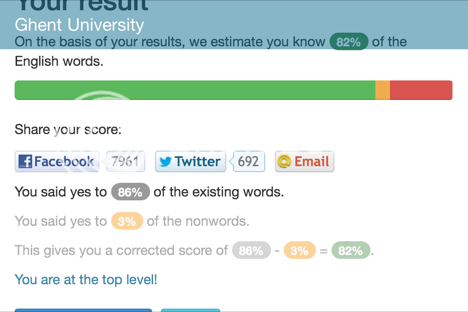 Edit:much better the second time with an 80%. Only 9% knowledge of "imaginary" words this time haha.  I think the English website should learn math.  86-3 does not equal 82....