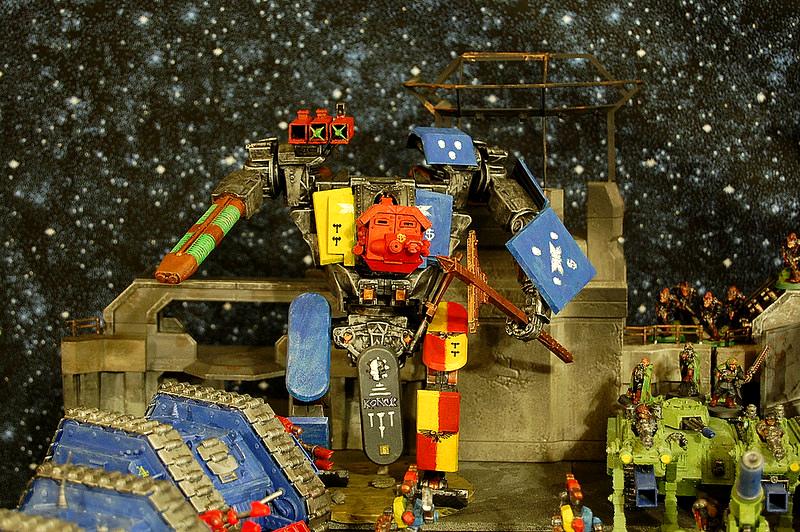 the smaller walkers are space crusade dread/attack bike ride along bash the knight titans are non GW stuff of course, the one with the massive chainsword is a Kit by "Heinrich 5" ( http://www.ebay.com/usr/henrich5) and the other is a recent toy kit thats been bitted out using Mostly old RT vehicle bits
