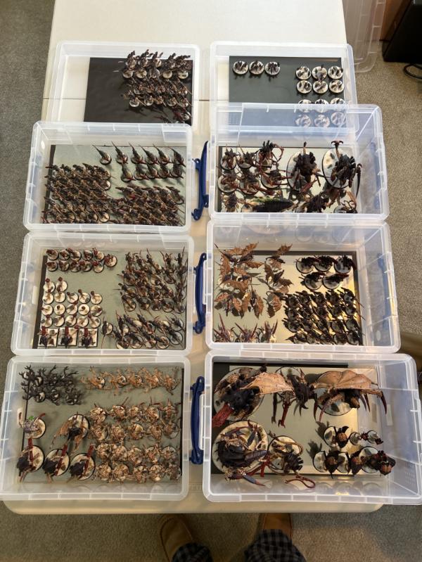 The other two 4L boxes are for the bulk of the nids who don’t need a lot of headroom, but don’t squeeze in a nice as termagants. Like the genestealers with arms everywhere and the jumpy hormagaunts.