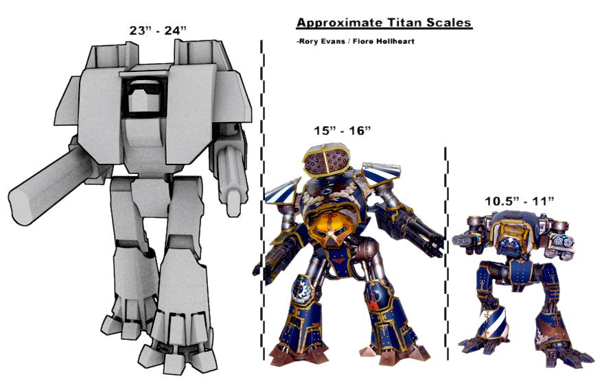 Um I do know that a space marine is generally around 8ft tall in power armor, as far as titans go, in helsreach a tech priest was running out of I think an Imperator(don't quote me) and could barely walk when the thing's foot came down it shook the earth so much