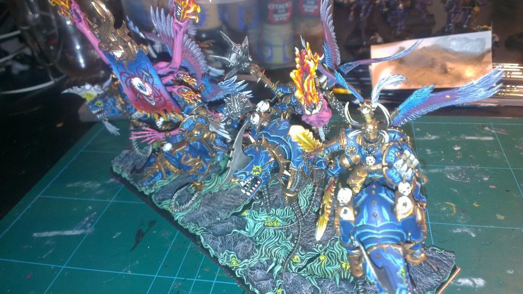 I love it! Really, excellent conversion  Still obviously Skullcrushers but distinctly Tzeentch. You've almost got a perfect balance between those two elements. The one thing that doesn't feel right is the banner. Not the banner itself but rather how it obscures the guy holding it. Aside from that I really like what you've done here. Keep up the nice work. Peace