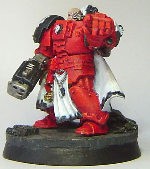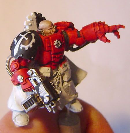 @jojo_monkey_boy - To paint the red I start over a white undercoat and paint a couple of coats of thinned red gore, this is shaded with purple ink in the recesses. the highlights are done by adding blood red in about three stages to the red gore until it is 100% blood red then blazing orange is added in the same way as the blood red to the mix withthe last coat of blazing orange going only on the very highest points. The entire red is then glazed over with a glaze of red gore to combat some of the orangeness coming from the highlights and also to smooth over the general highlights. The red has more depth which i hope will show when I take better photos. I hope this helps.