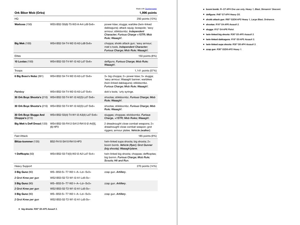 However I do agree about the Nob Bikers, especially since I've converted a bunch of them up. That list looks good, however I'm pretty opposed to Big Choppa Nobz in the boyz units and I'd want skorchas on all the bikes. I've never had much success with Nob Bikers for some reason though, so I'm not as confident of a Nob Biker list as I am of a battlewagon one - those fail also but at least I understand why they are failing
