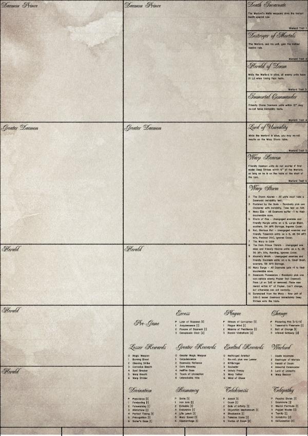 Surely creating this 'sheet' would still require you to print on it every Lesser, Greater, Exalted Reward, all your locuses, warlord traits and possible powers, since all of these are created randomly for each game? I was trying to come up with a solution which means that each model only has the rules that apply to it in a handy card, rather than a long, long wall of text in which three or four options are circled...