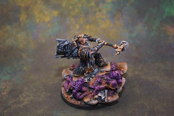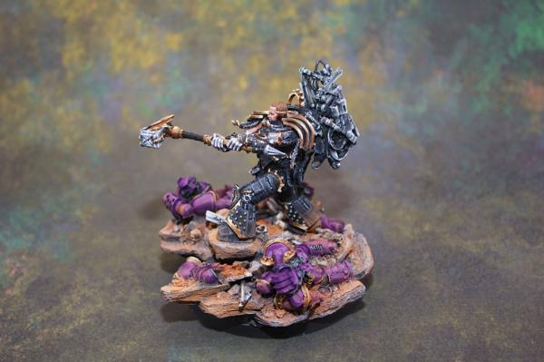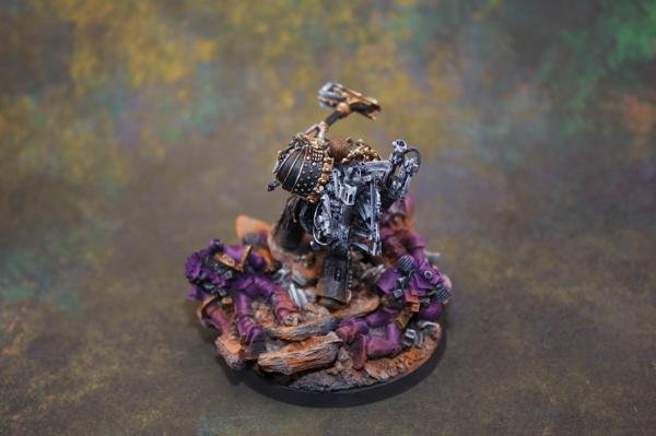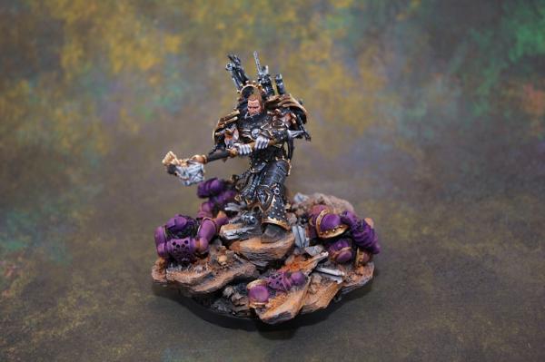 This is Ferrus Manus from Forgworld. It was painted up as a commission for a client. The miniature and it's base has been painted in a 'clean' style with minimal damage to either Ferrus or the dead bodies around him.The base has been weathered as well as the dead bodies and Ferrus's feet.