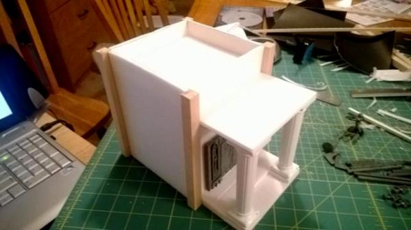 These shots show the basic structure and a bit of early detail work. The primary structure is mostly foamboard, with some square basswood rods for the corner columns. The foamboard has had the paper peeled from one side to allow for a better texture. The decorative columns on the "front porch" area are from the cake decorating section of Michael's (a hobby store). The doors and eagle-shaped support struts are from Games Workshop terrain sets.