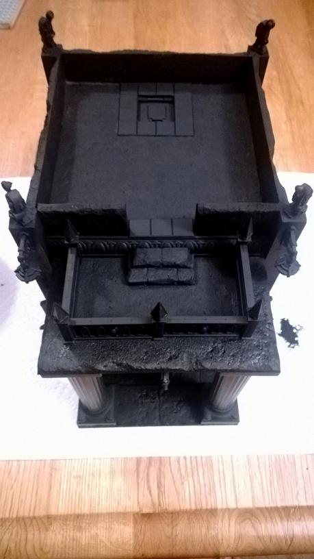 I have managed to get the base coat done tonight. I am hoping to do some dry-brushing as well, so I can work on details tomorrow and Thursday. This angle also clearly shows the balcony access from the roof, with the small, stone-slab stairway.