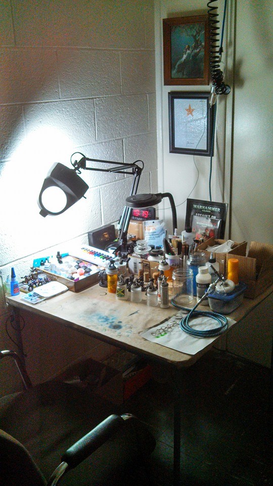 Of course, there are some things that help regardless of your exact set-up. Make sure you have good natural light available for looking at schemes in a natural way, and also a strong light on the desk/wall which can help with highlighting and just general detailed viewing. A magnifier of some kind is always handy for small detail. Somewhere to separate painting and modelling stuff is always good, and of course space to do one without being cluttered.