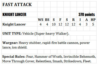 I also feel that you need to find a way to make the lancer faster than the other Knights, since I don't think fleet covers it well enough, they were used as scouts, so maybe giving them scout and the agile rule the Warhound and Eldar Revenant have?