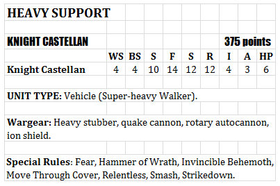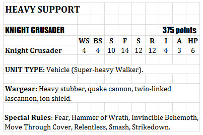 On the other hand I don't think Knights really lend themselves to a conventional FOC. A standard FOC serves little purpose since it'd almost never have any effect and on the occaision it does you have an army more imbalanced than a non-knight army does when it's maxed out a FOC category.