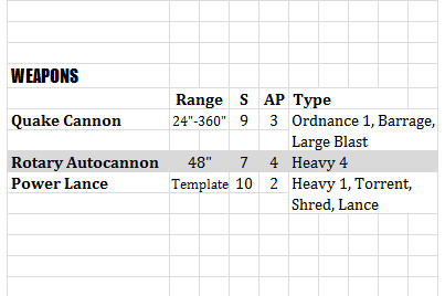 Slightly edited the weapons chart - replaced the Quake cannon entry with something more akin to the Warlord version from V1 Apocalypse. I toned it down a littler - only 1 shot, and Large Blast instead of 10" to avoid people having to go out and find templates that are no longer available...