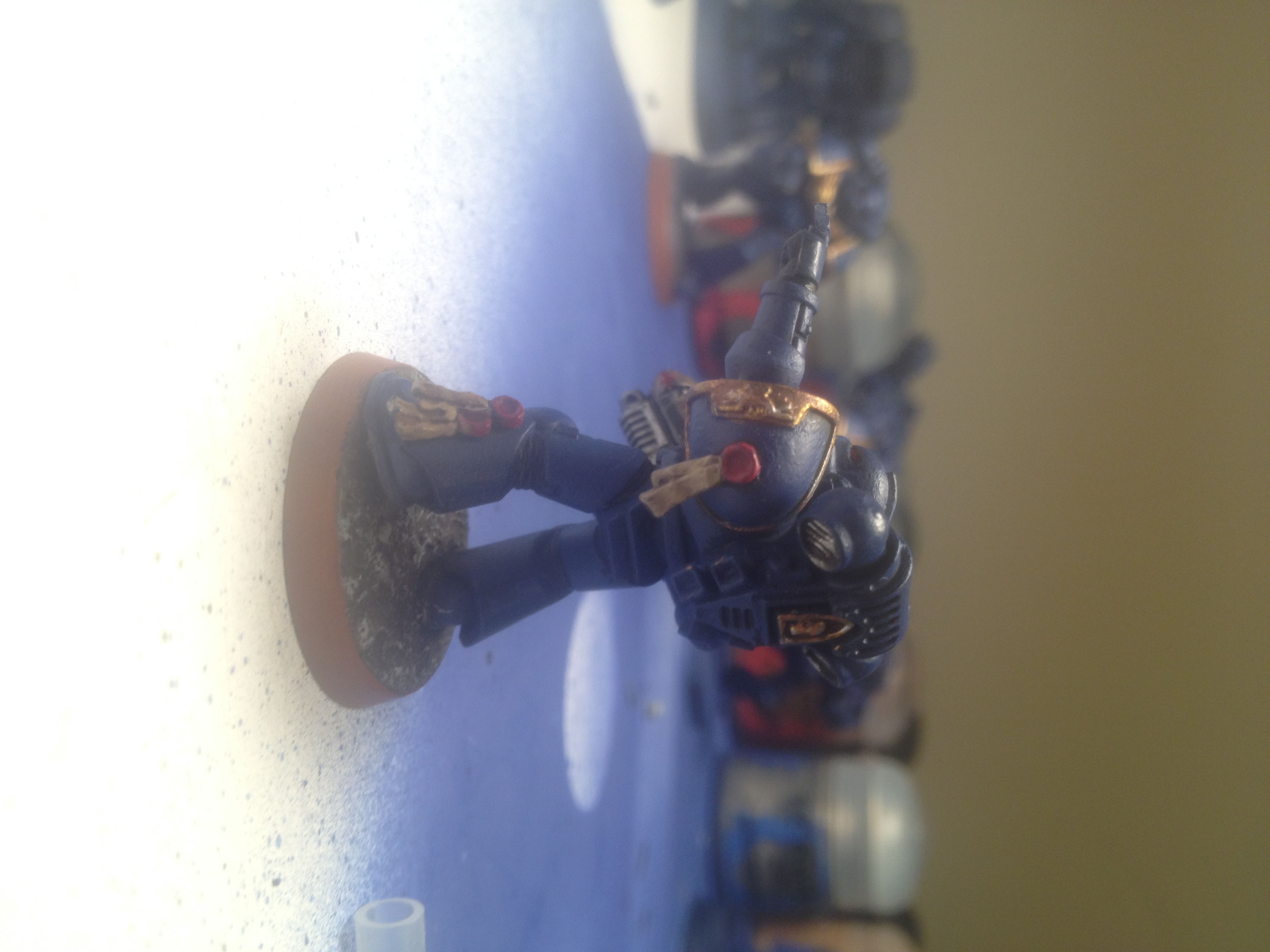 Looks good nice deep dark blue, your golds look great nevelon has gotten on me too so listen to him about the shoulder. Overall a very good space marine. Eventually I would add some highlights and to reiterate thinning your paints to get that nice even smoothness.  and better pics would help out too!