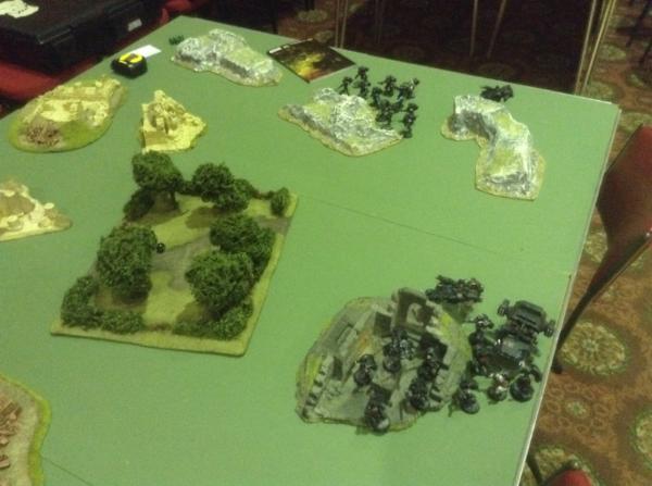 Speaking of terrain, we agreed that everything on the table gave a 4+ area coversave, except for the forest in the centre. Nighfighting was in effect on turn one. We both got Warlord Traits that only applied in objective games, so that was something of a wash.