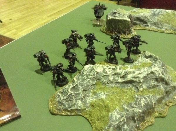 After we did deployment, Alan rolled for his Red Thirst; the Assault Squad in reserves had it, along with the Assault Squad in the centre of the table to which was attached his Librarian. He tried to seize, but rolled a 4.