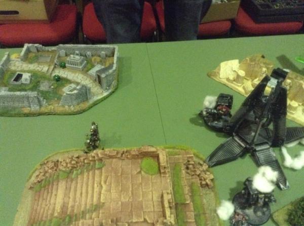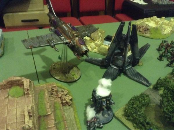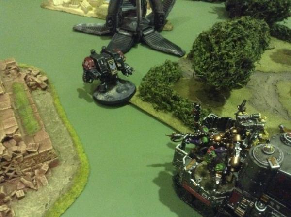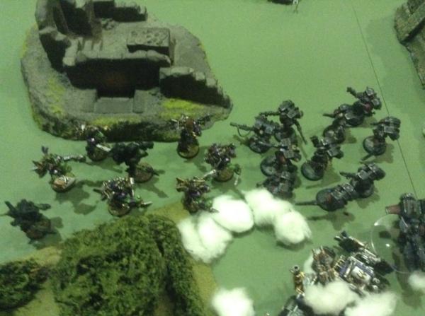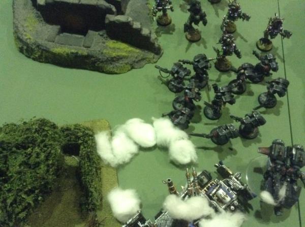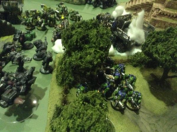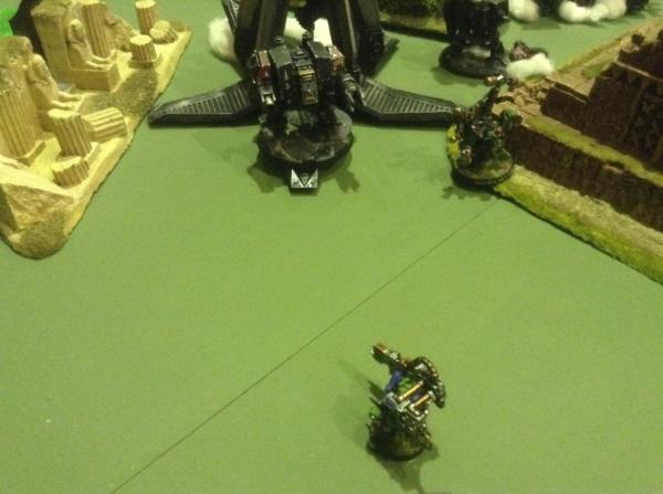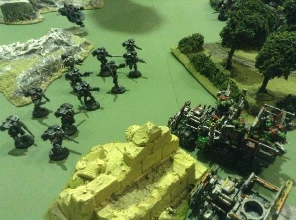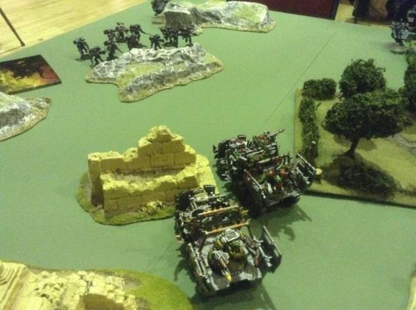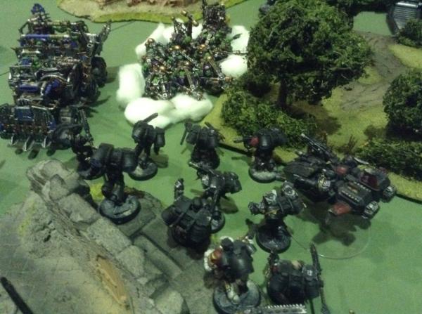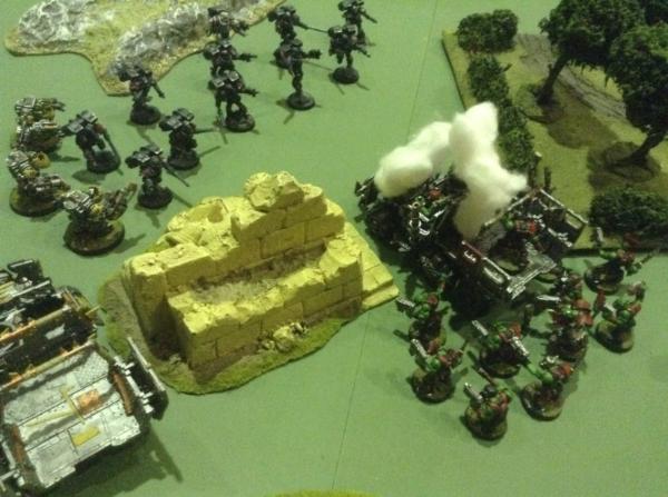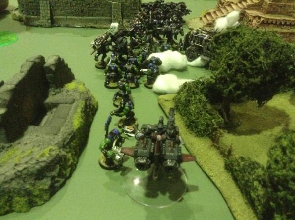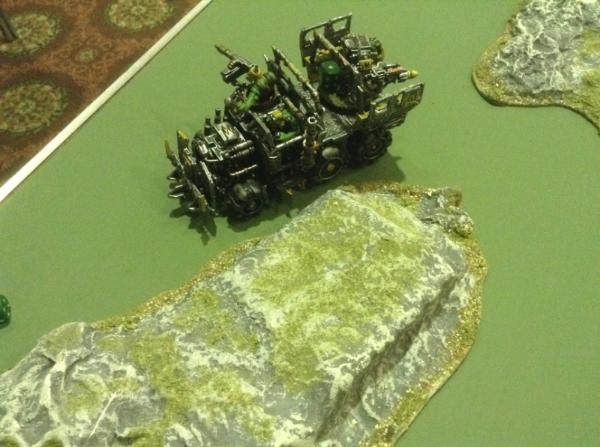 The turn started with Space Marine trickery, as a Furisio slammed into the earth behind my Battlewagon. Ruh roh.