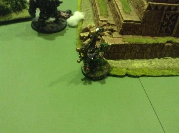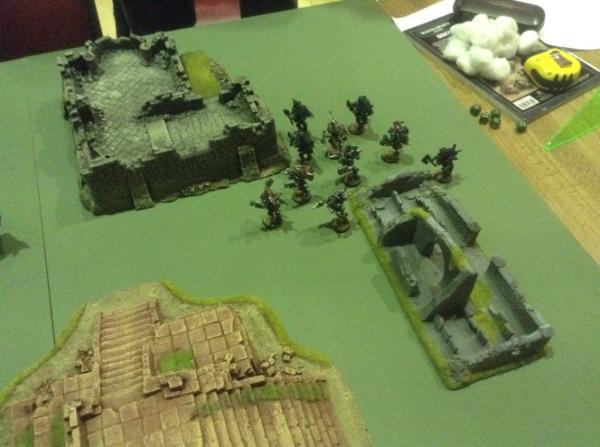 Finally the Stormboyz got a massive 16” move thanks to their jumpacks, and headed behind the ruined building for cover. My opponent was pretty impressed with these guys after I explained their movement rules, and clearly thought that I was insane for not using them more. He may be biased though, judging from his unit selection…