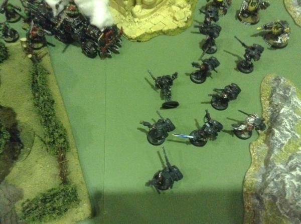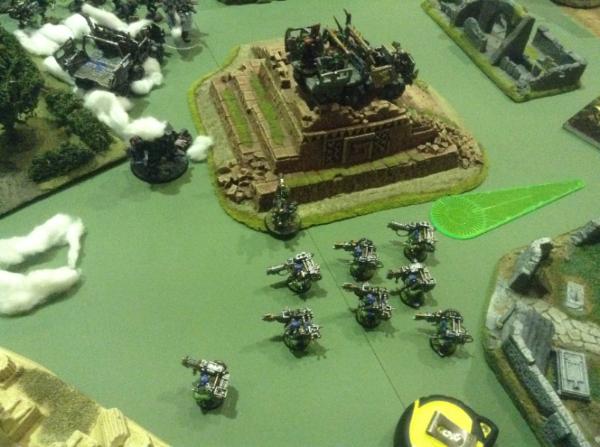 Meanwhile my Burnawagon and the other two mobz of Boyz headed for the main enemy squad. All three vehicles had the KFF cover save here. I had ruminated long and hard on whether to hold back and hope for better position advantage in a turn’s time. However I eventually decided that my opponent’s multi-meltas were too dangerous (especially mounted on the Landspeeders), so I would have to close and ensure that my opponent couldn’t strand me in no-man’s land. There is a certain element of ‘move and pray’ with this army anyway.