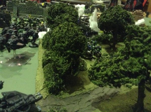 @Tetsuo: Thanks! Shattered Suns Turn 2 With no points on the table yet, the need to start the killing was almost overwhelming. The Meganobz and red Boyz tried to communicate this to the flank the Assault Marines, but the red Boyz were being a bit useless and only got 3 for their difficult terrain move. The Burnas moved a bit forward, primarily to get as much delicious auto-hit template goodness as possible. The Stormboyz moved a solid 17” over the building, a statement of intent if ever I saw one. The were going to menace the Typhoon, which I hate; not because this one in particular had done me ill, but thanks to some Dark Angel ones that harassed me a recent tournament. Revenge – like Justice – is blind. The yellow Boyz also hopped out of their stunned Trukk, aiming to krump some of the main Assault marines. I was going to charge the blue Boyz in as well, but the traffic jam was a bit too much for that. So instead the driver reversed them into the crater, and they levelled their Shootas at the other Landspeeder. Sadly they did it no damage though, as fishing for 6s doesn’t always work. Far more important, however, was that the Dakkajet, lord of the skies, came onto the table. It lined up to take revenge on the Furisio for the Warboss. The above photograph shows the table at the end of the movement phase. On my left flank, the Meganobz scorch down one of the Assault Marines… …while the red Boyz took another one off the table. I managed to kill a fair few of the central Assault Marines, which was satisfying, but I had rather hoped for greater things from the Burnas. The silly bastards managed to pass most of their armour and FNP saves. Meanwhile the Furisio took a good couple dozen of bullets into its arse and fell over. Good times. This is my kind of party. The Lootas evidently agreed, as they blew the Droppod into many tiny little pieces. Sweet, sweet killpoints. The assault phase saw more failures than I like: such laziness is most unbecoming in this particular killerfast horde of murderers. Here the red Boyz fail to join the Meganobz in charging the Assault Marines on my left flank… …while the yellow Boyz also failed to get stuck into the central Assault Marines mob. I didn’t charge the Burnas, since I figured that they would do better if they sat still and waved their flamers threateningly on overwatch. The Stormboyz went to go say hello to the Typhoon crew. Some people can’t take a bit of friendly rough-and-tumble. The Meganobz also play a bit dirty, it must be said. They took one wound before cutting four Assault Marines in half. But they didn’t run away. Just as well, since ATSKNF is just about the most enraging special rule in the game, and makes it worse for me if the Assault Marines actually “fail” their leadership test. Makes sense. Angels Amaranthine Turn 2 The Landspeeder that had been lurking near the Meganobz skimmed to the left, and lined up a shot on the Dakkajet through the forest. It would fail to hit this turn, in large part because the Librarian rolled an eleven for his Prescience test. Although the second Furisio didn’t arrive this turn, the Assault Marine squad did. They arrived perfectly, and took the time to place all of their flame weapons next to the yellow Boyz. At the end of the movement phase. The central Assault Marines gunned down a pair of Burnas, who thankfully didn’t run away. The Landspeeder that the blue Boyz had completely failed to kill returned the favour by blowing their Trukk up. However, thanks to the hilarious ramshackle rules it didn’t actually explode, and they just ambled through the forest a ways. I liked this angle so much that I took another photograph of it. It should be a Royal Marines recruitment poster. But it wasn’t all good news, as the yellow Boyz got blown away in a firestorm of fairly epic proportions. Ruh roh. Since the yellow Boyz had been so efficiently executed, my hold on the centre was looking distinctly flimsy. The Assault Marines with the Librarian surged forward into the Burnas, losing two of their number to overwatch. Amidst the wreckage of the Battlewagon, and flanked by our other units, the two units clashed. Although the Librarian wiffed, and the Priest’s three successful wounds were outrageously saved on triple sixes, the Burnas got butchered down to just one model before they got to swing. That one Burna managed to powerweapon one of the Assault Marines, but it wasn’t quite enough, and he got punched in the face by the powerfist Sergeant for his troubles. You may not be surprised to hear that I failed this particular roll. But, to give credit where credit is due, that Mek can run like a bastard when it comes down to it. He was out of there like a fat kid at an all-you-can-eat buffet, and the Assault Marines were left to consolidate. I didn’t photograph it, but the Meganobz killed another four Marines over on their side of the table. Very precise, those ladz. That left just the Priest, looking a bit sad and alone. The Angels Amaranthine remain in the lead, with 7 points; but the Shattered Suns are slowly gaining, with 4