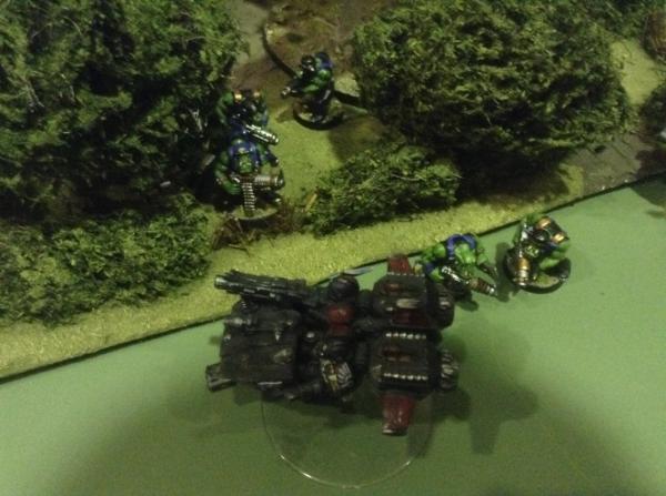 Killing Landspeeders is one of my favourite activities in 40k. They just fall over and burn so easily! Here the blue Boyz slope out of the treeline with murderous intent.