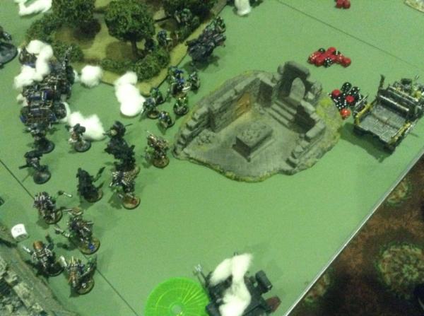 I got tremendously excited at this point while thinking about the throwing grenade rules, and so the Stormboyz tossed one into the Assault Marines. Obviously it immediately scattered back into their own unit, and blew two of them into little pieces. Legends in their own lifetime, these guys.