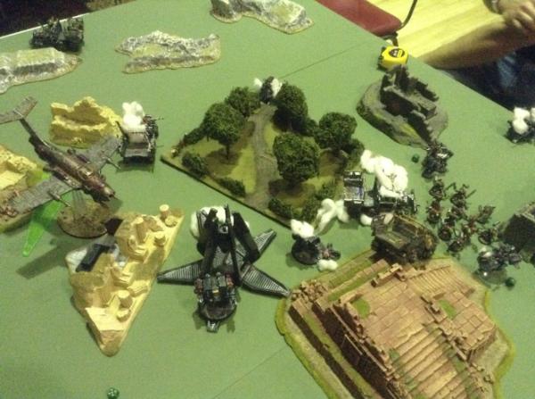 Meanwhile the Assault Marines (toting two Meltaguns) and other central Landspeeder moved up to try and neutralise the Battlewagon.