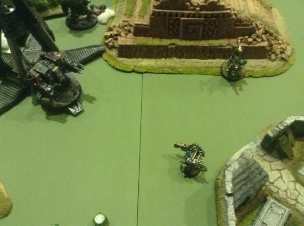 But note the cheeky 5th edition style multicharge; thanks to the rules this edition, the ladz wouldn’t get Furious Charge by doing this, leaving them on S3, and so the blue Boyz’ nob went into the Landspeeder by himself in the attempt to punch it down. I wasn’t entirely sure on the rules for coherency in melee, so I decided to just congaline some coherency over there to him.