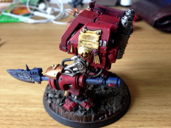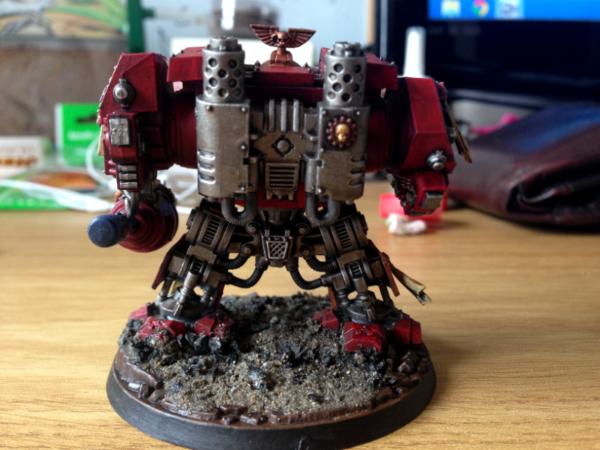 A lot of the advice is also about giving the model more visual interest. Things like weathering (or transfers, or freehand) can liven up areas of the model which are otherwise large, flat expanses of color. For example, the dreadnought's right leg armor, and his right shoulder, are largely flat areas painted a single color. Putting a campaign badge, iconography, or battle damage on these areas, can make them more visually arresting. The leg with the (frankly awesome) scroll looks much more interesting than the other, just for that reason. The exhausts on the back, which are just bare metal, could also be painted or weathered to show soot build-up, making them more interesting as well.