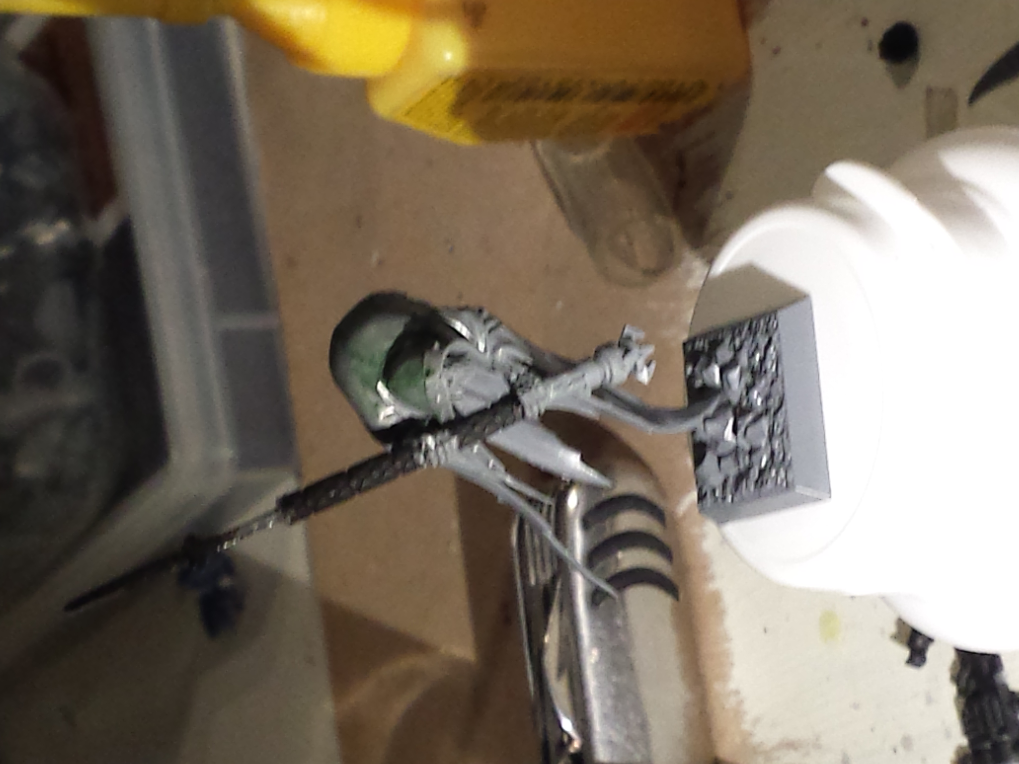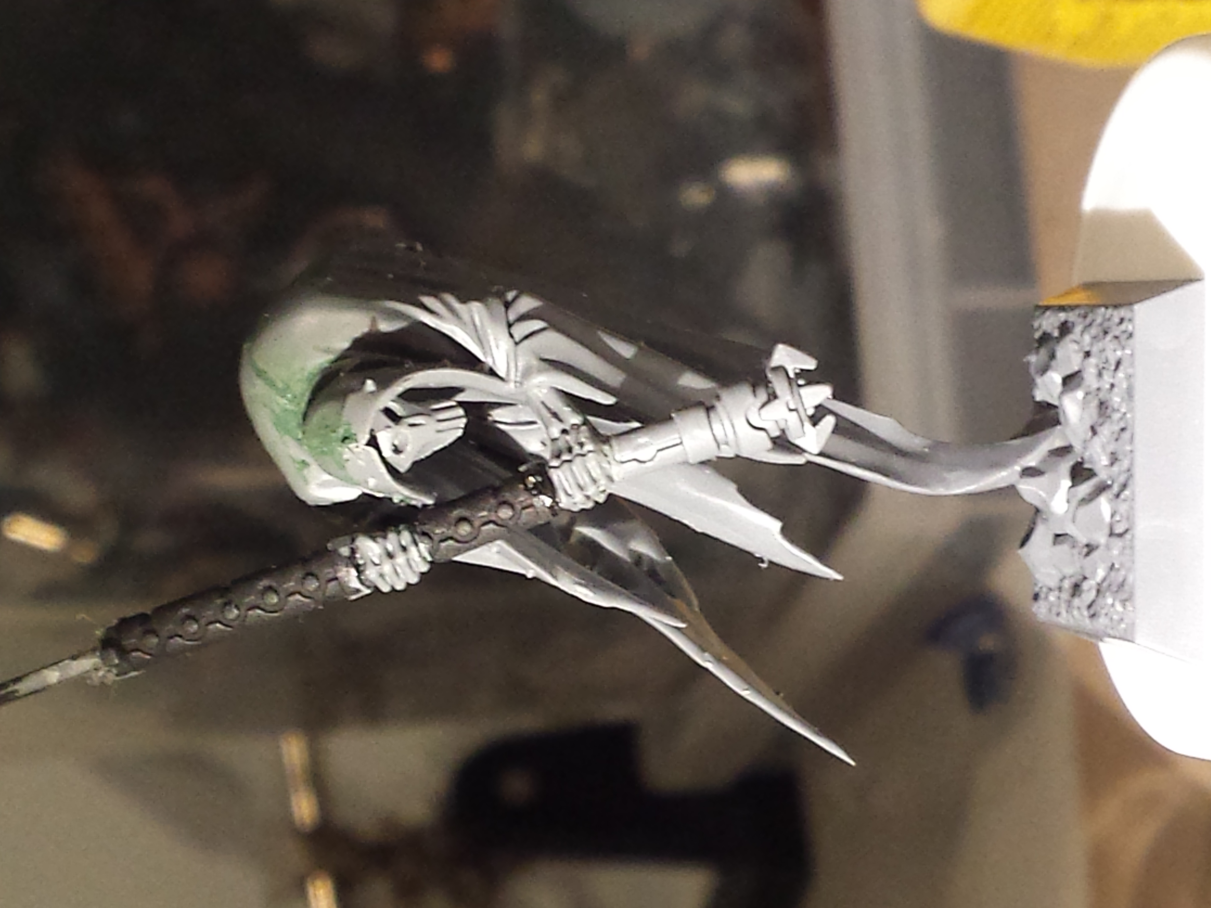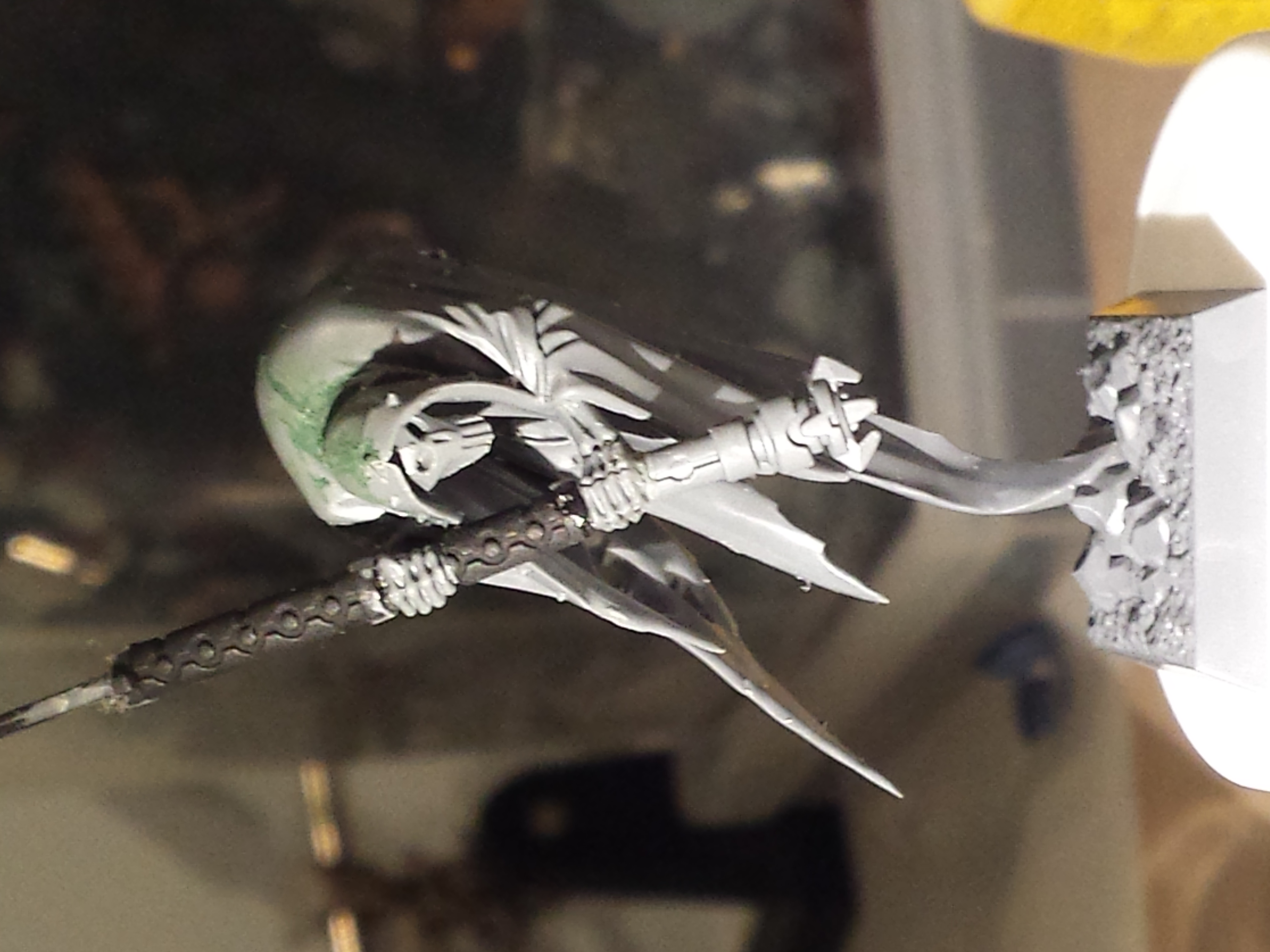 The model is a Vampire Lords Cairn Wraith and in all honesty the only bits that I have changed are the staff. This is because, while the scythe looks awesome its not a "staff" as per the codex weapon entry. the staff was made from the blades on the immortal gauss blasters, the barrels of the gauss blasters and the end piece is cut from the tomb blade kit