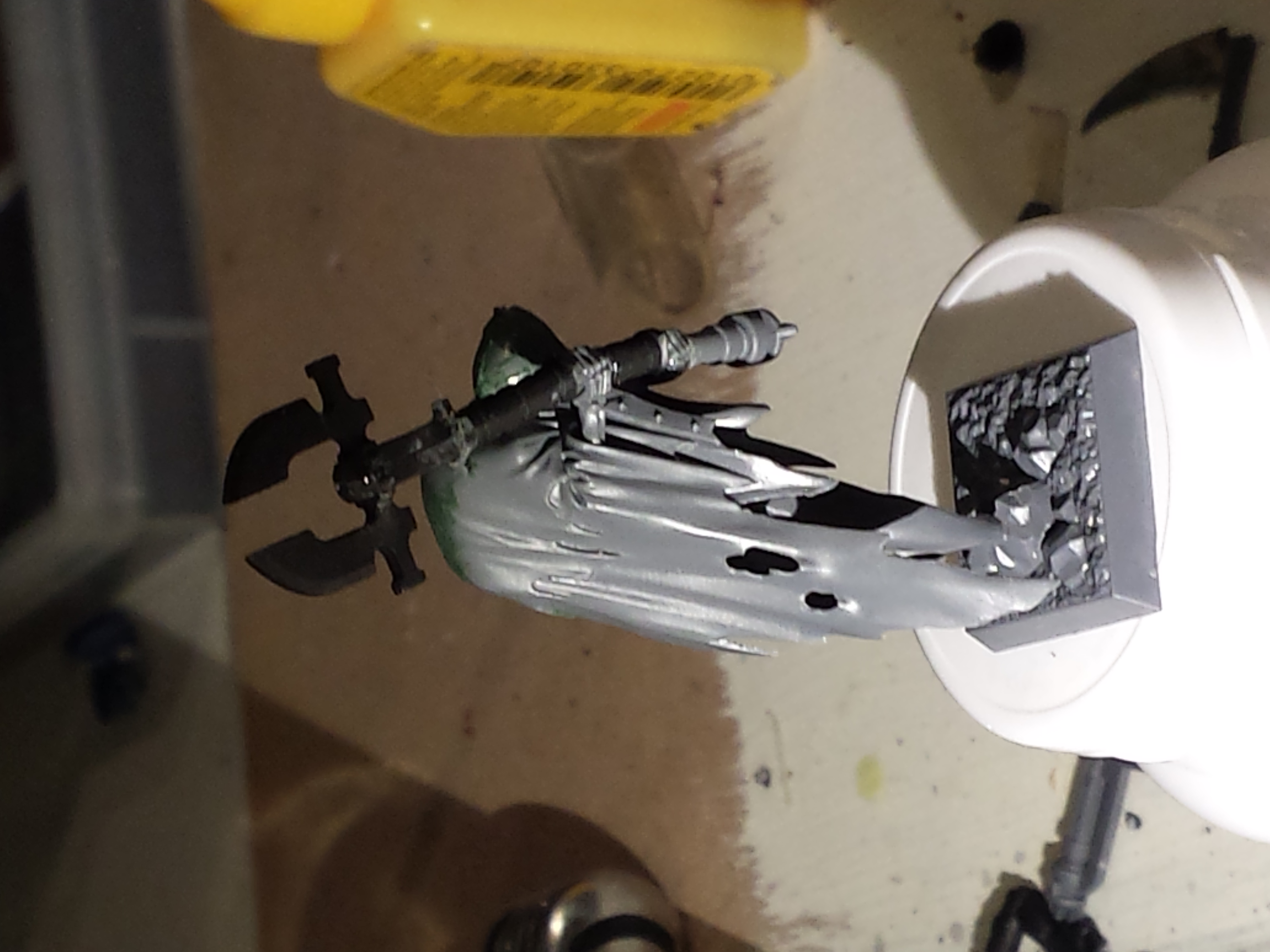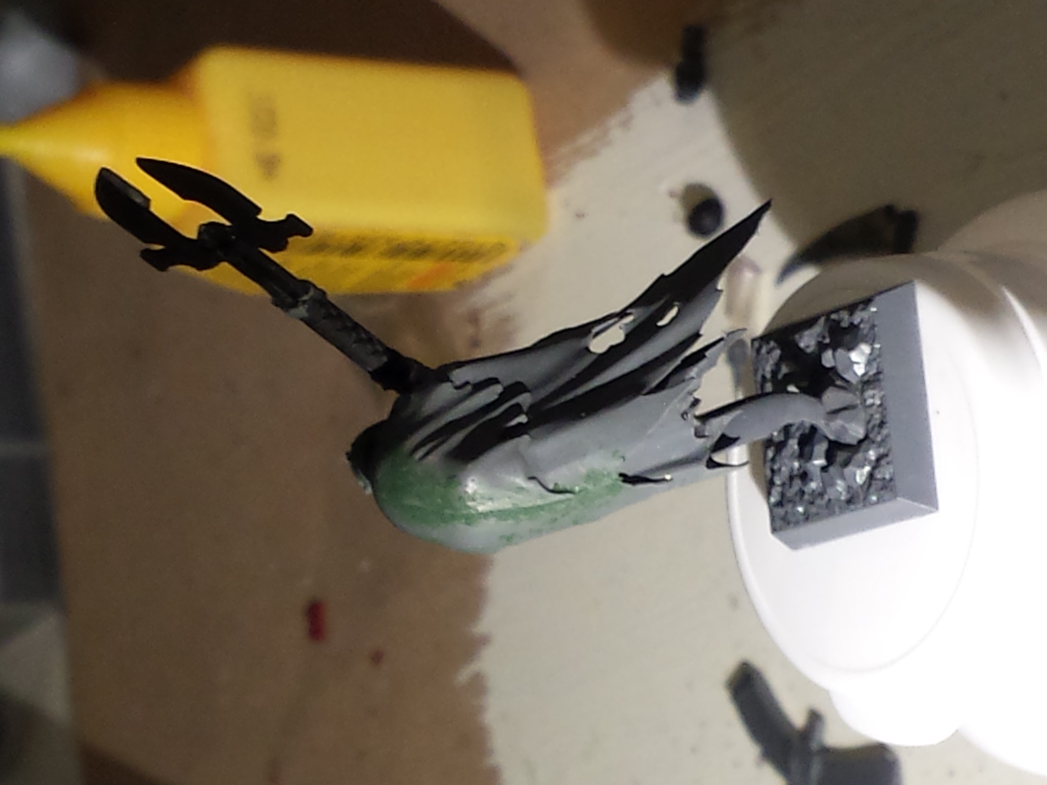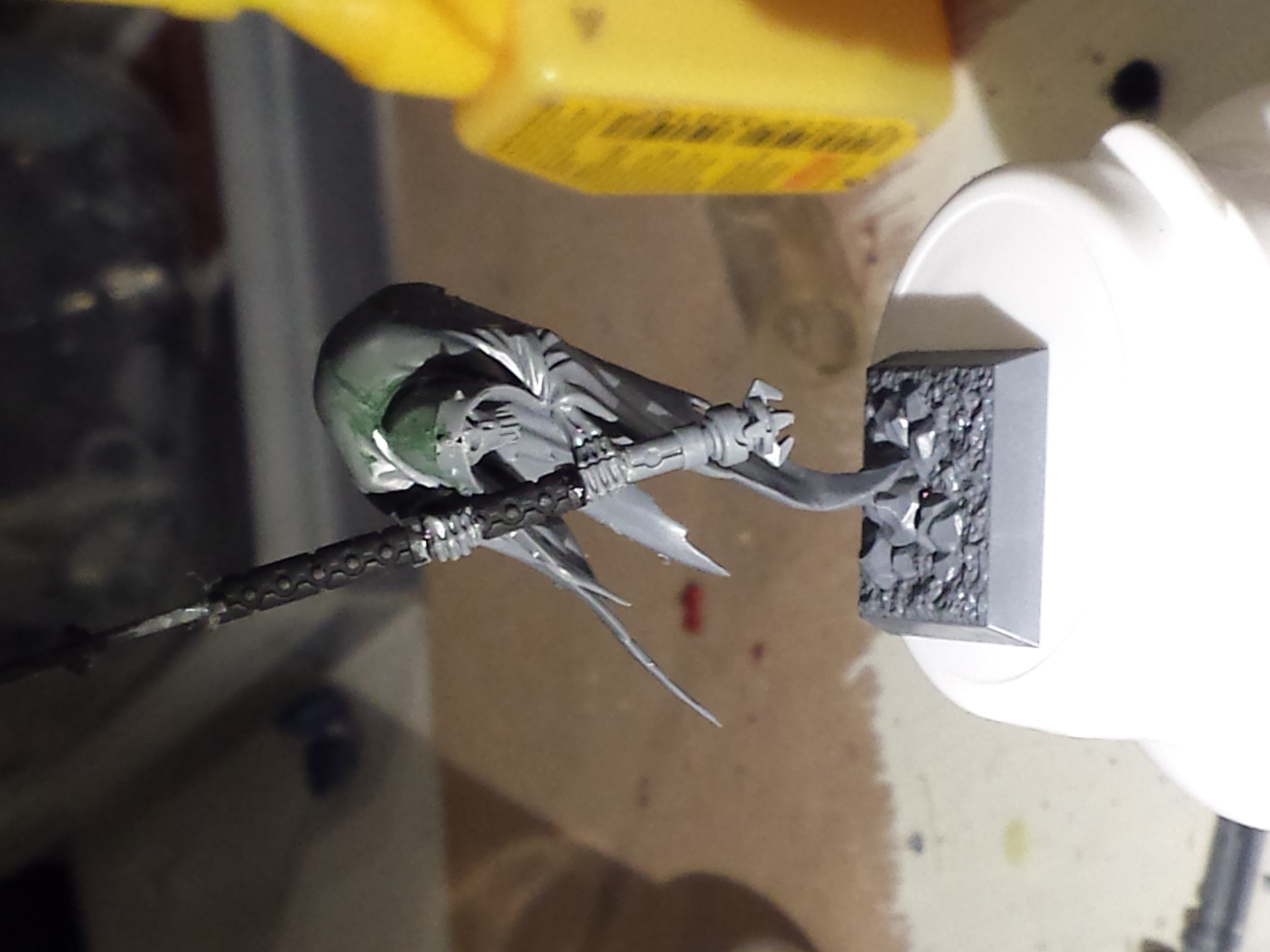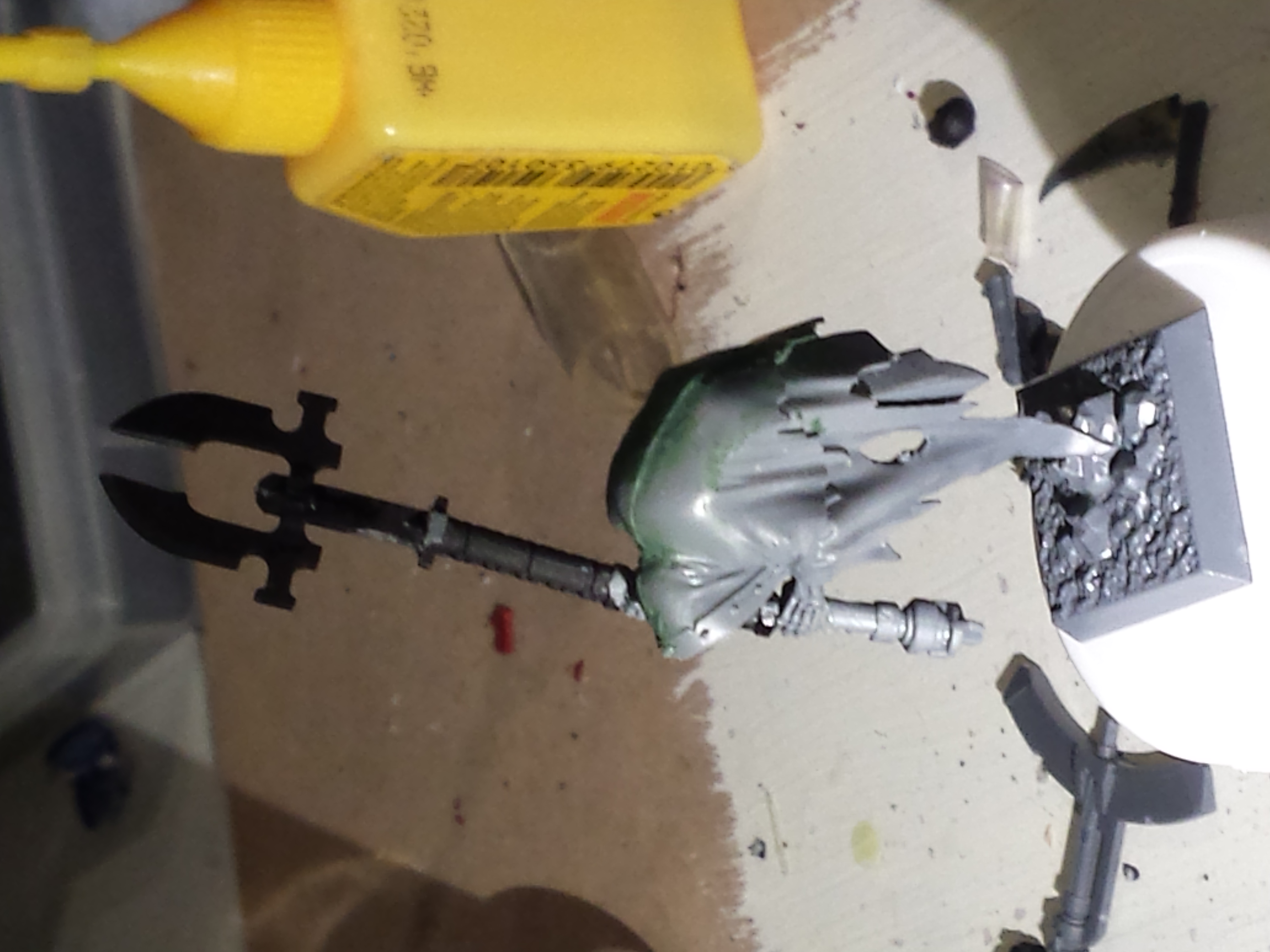The model is a Vampire Lords Cairn Wraith and in all honesty the only bits that I have changed are the staff. This is because, while the scythe looks awesome its not a "staff" as per the codex weapon entry. the staff was made from the blades on the immortal gauss blasters, the barrels of the gauss blasters and the end piece is cut from the tomb blade kit