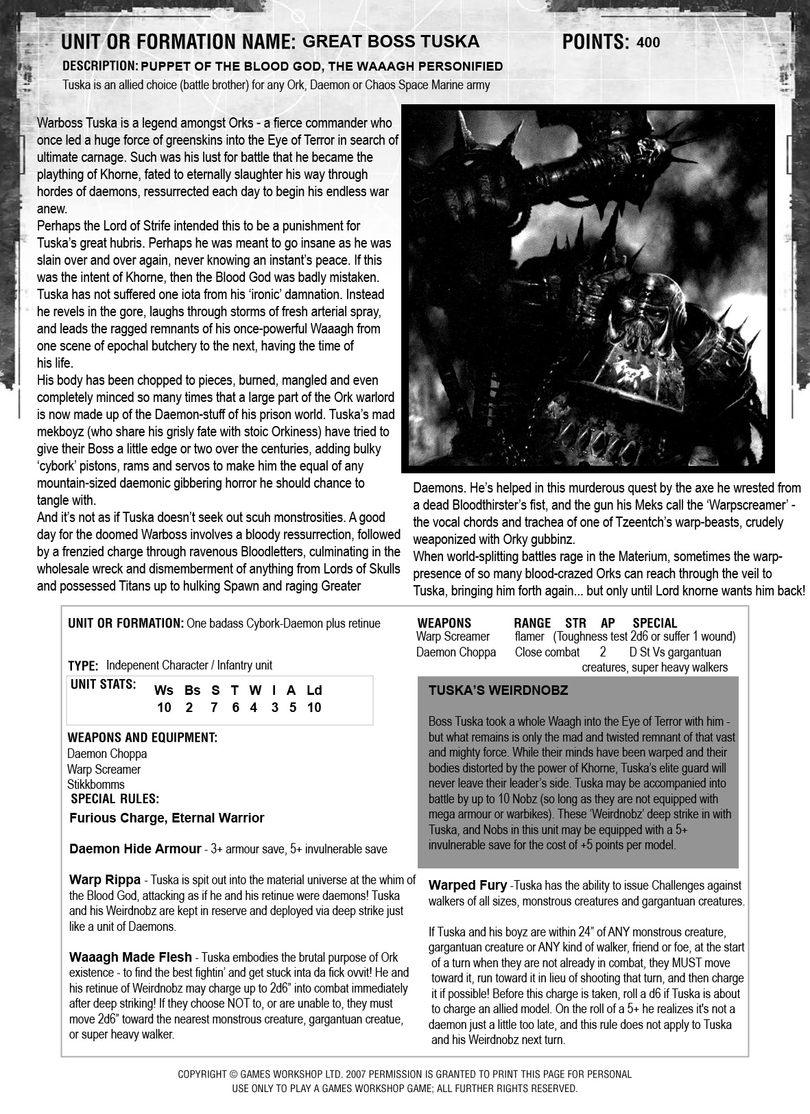 lexicanum wrote:After hopelessly wandering various Daemon Worlds for many days, Tuska finally met the fight he was looking for when he encountered a world ruled over by a Daemon Prince of Khorne known as the Blood Prince. Battling the creature and his Daemonic hordes, Tuska suffered many deep wounds and his Boyz took heavy losses. Just as the Blood Prince was about to finish Tuska, his Weirdboyz managed to distract the Daemon using their psychic powers, giving Tuska enough time to impale the creature between its legs with his Power Klaw before being killed himself.