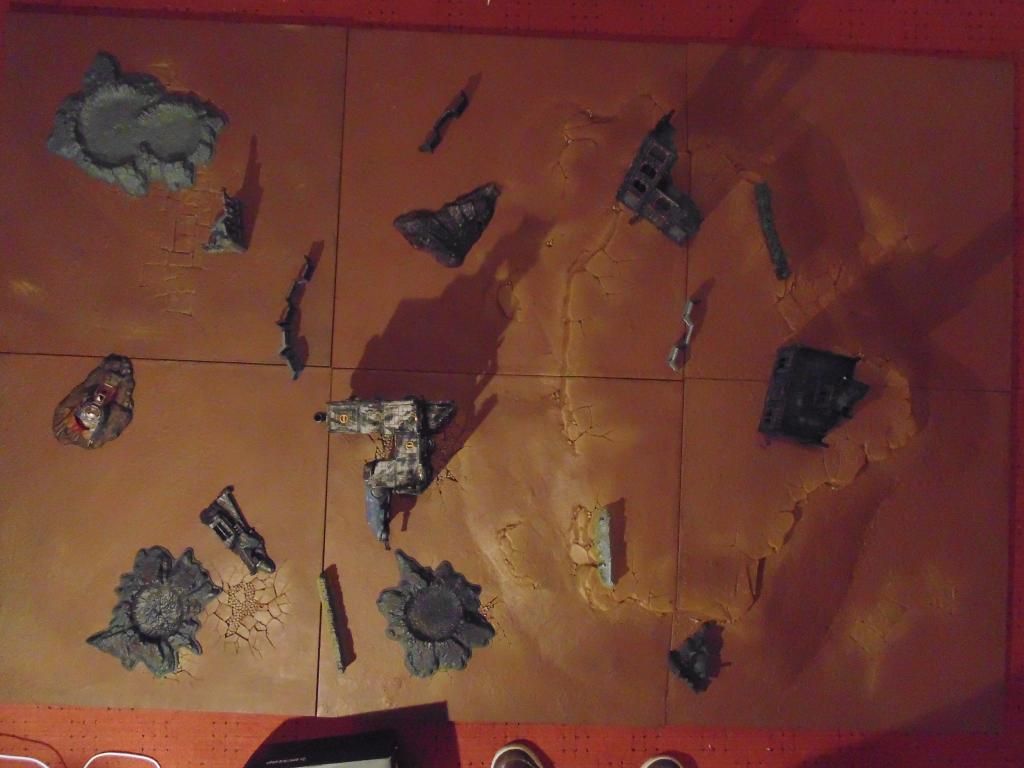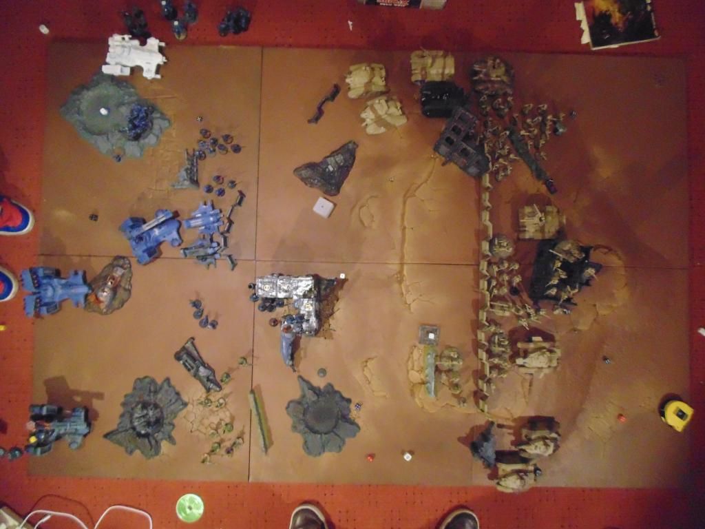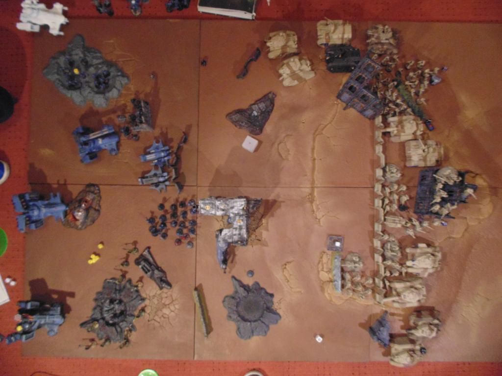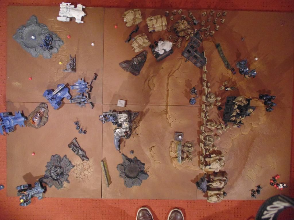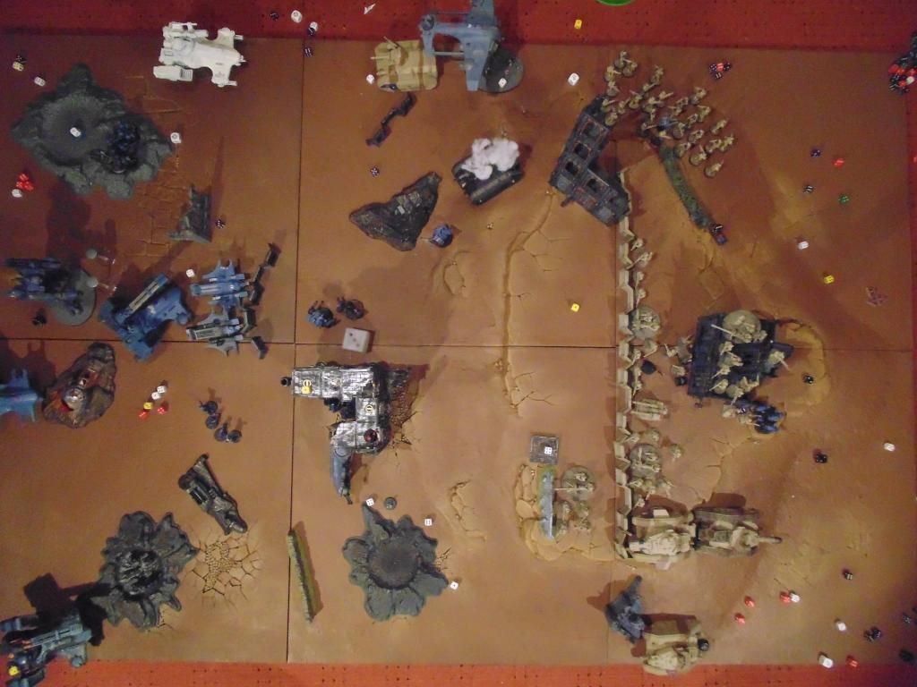 Not a lot of movement from the Tau, more just moving into firing positions as most of their army was in reserve. He also took both his objectives, the one in the crater was sabotaged and the one in the building did nothing. He did have a good turn shooting though, blowing up both my Vanquishers! The explosions killing 2 conscripts and 3 guardsmen. Damn, there goes my answer to his riptide as I have no more tanks with those amazing beast-hunter shells!