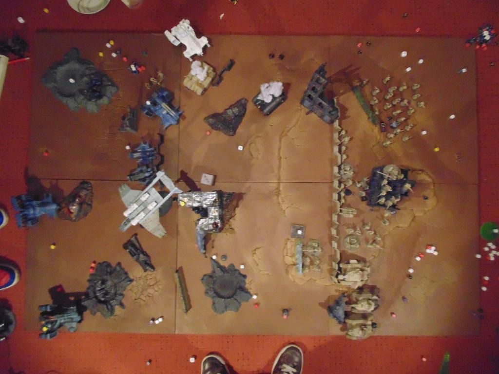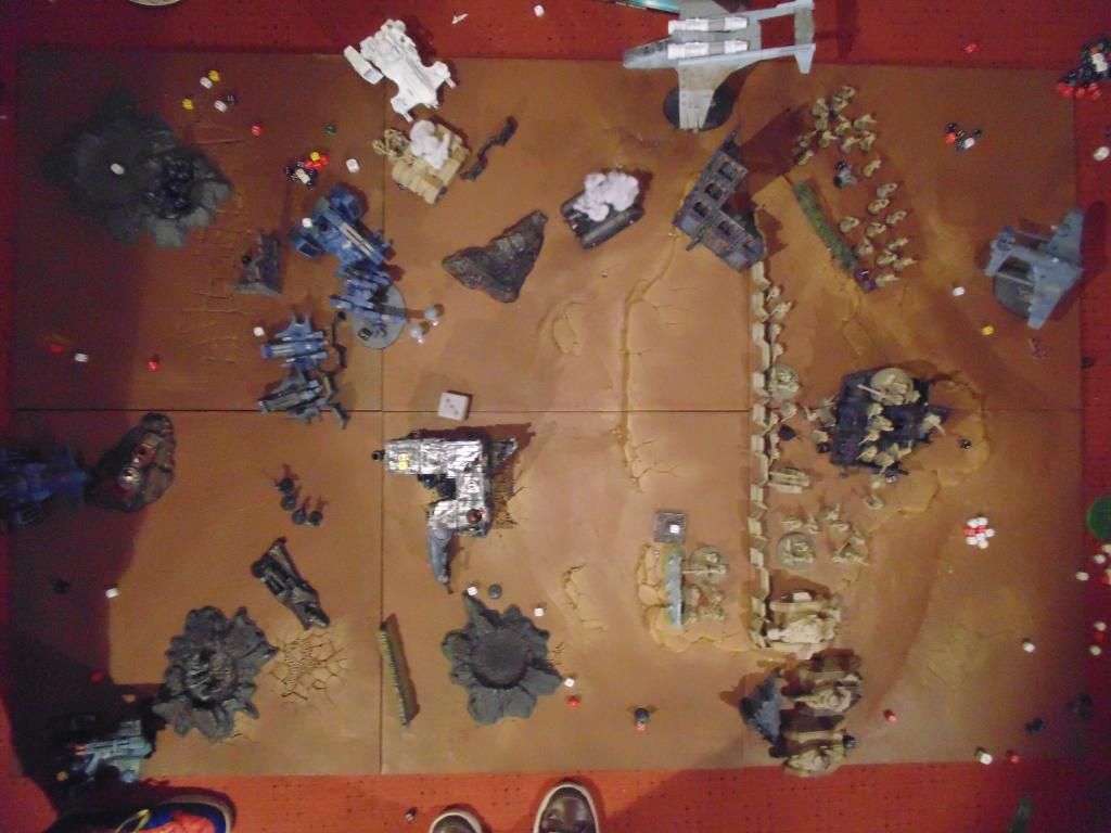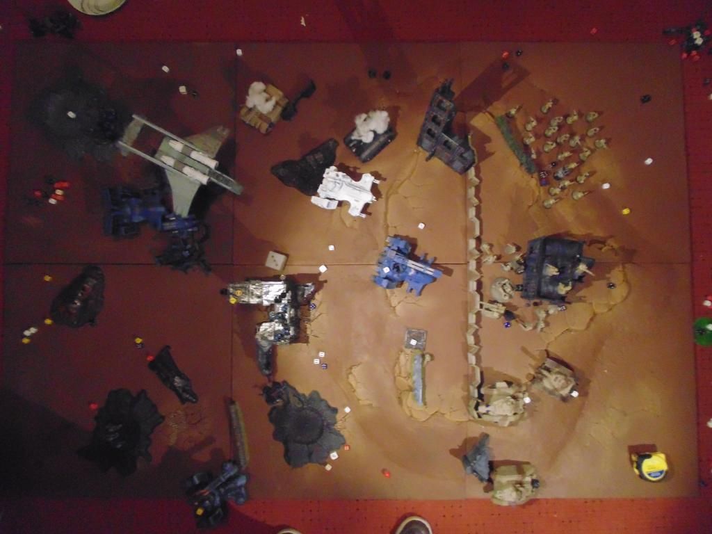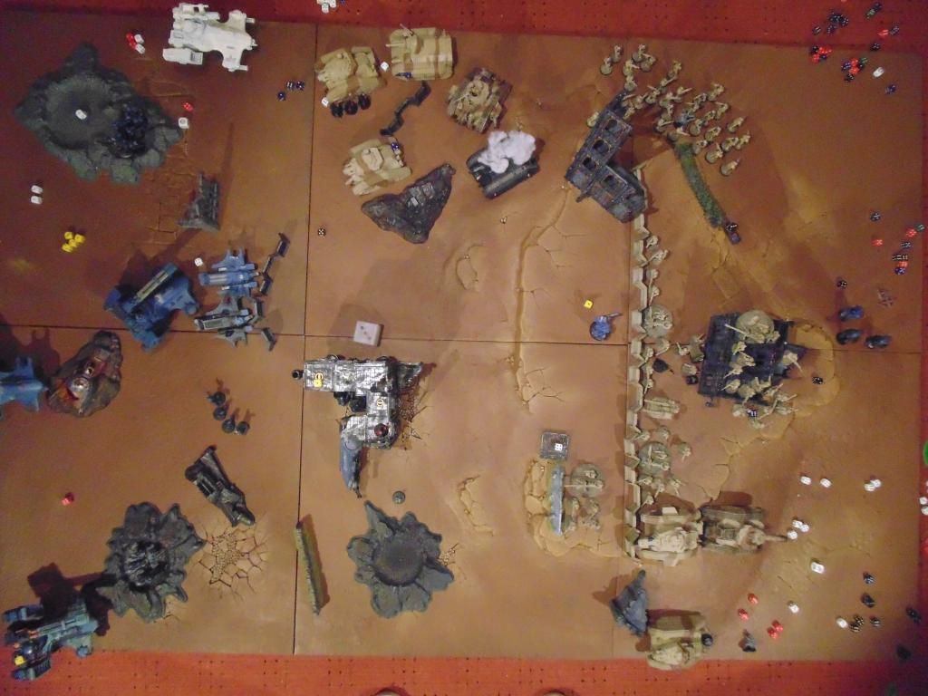 The firewarriors that had appeared in the building suffered for it and lost half their number. The Vendetta fired AGAIN at Longstrike and AGAIN did nothing. The executioner glanced itself on a gets hot! roll. Everything that could hurt it fired at Longstrike but did no damage. However the immobilized demolisher got to fire its demolisher cannon for the first time all game, immobilizing the hammerhead that had moved forwards just into range. So far the Guard had a good lead, and would win as long as they could weather the Taus shooting for one more turn.