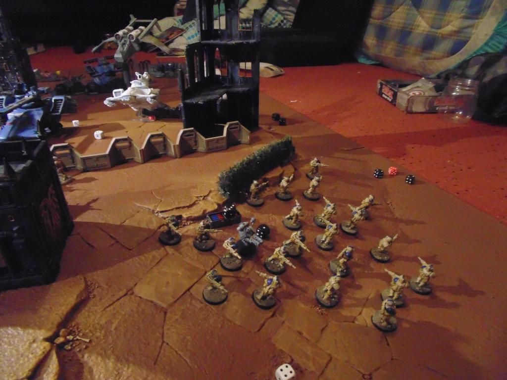 The lone guardsman was killed off, as was the officer from the last platoon command squad, another infantry squad was mostly wiped out as well. The firewarriors that had so far hidden all game popped their heads up too and the Guards scoring units were being whittled down, but not enough to clear them off the objectives. We rolled to see if the game would go on, and it did! So the Tau still had a chance.