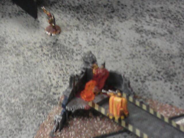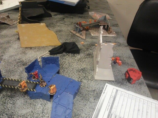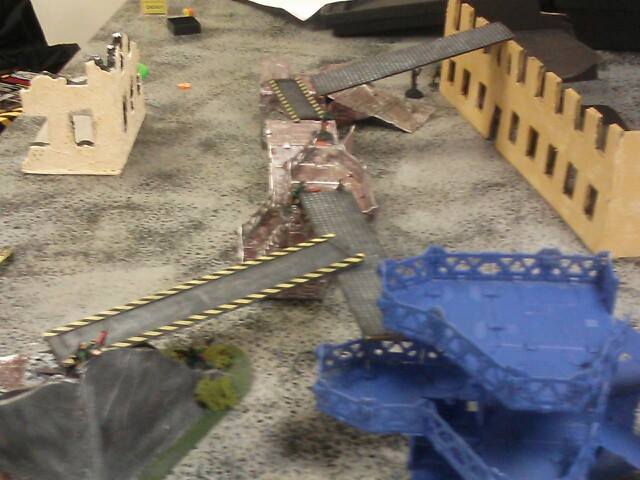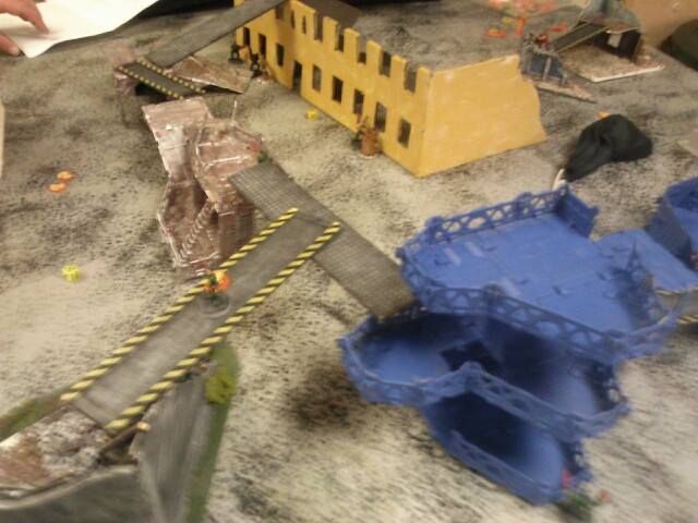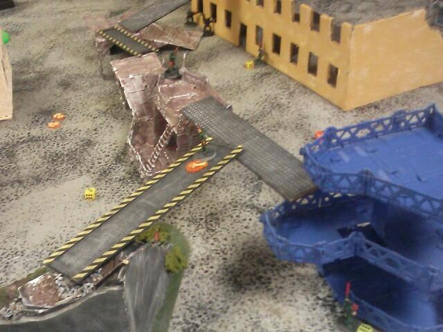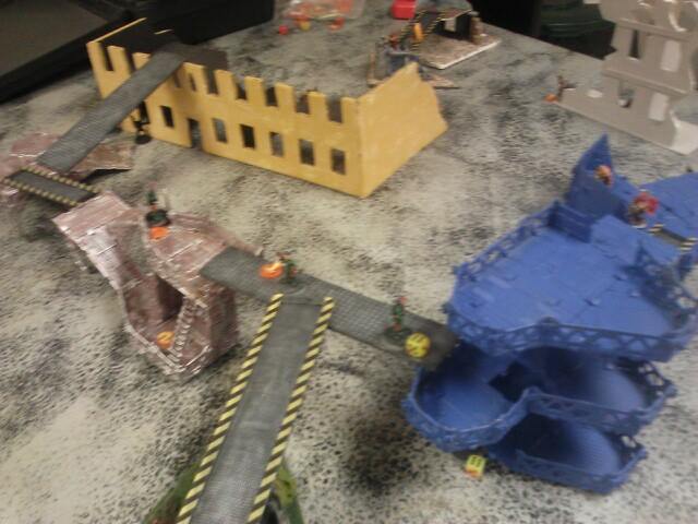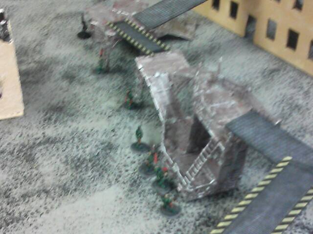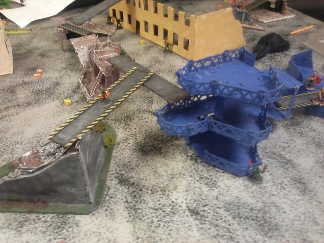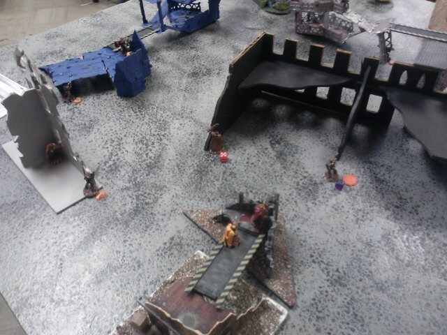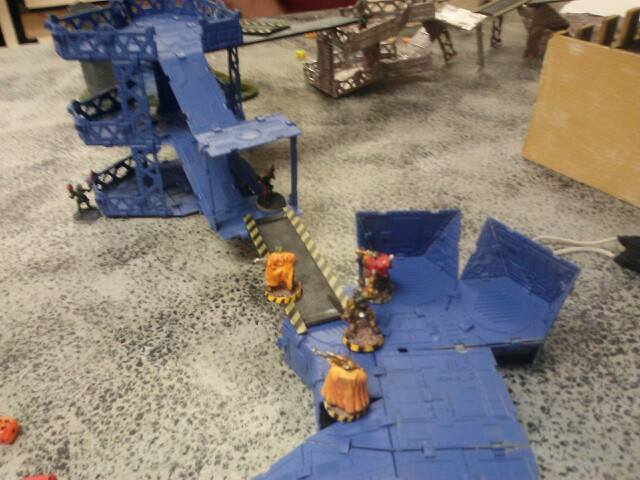 Turn two: He starts off by moving his juve and two gangers into better position to take a few shots at my juve and leader. His other juve moves out of hiding and triggers my heavy's overwatch, which takes him down. He shoots at my juve with his ganger and juve, missing once and then hitting but not killing him which pins my juve. His other ganger misses my leader completely, and puts his other models into hiding and runs another. My part of the turn comes up, and my juve cannot do anything due to being pinned. My first heavy tries to take a sustained shot at one ganger on the catwalk, but jams, then my other ganger aims and takes him out of action, and passed his ammo roll.. My other heavy does his sustained shot but jams and my ganger by him shoots and misses. My leader moved up and fired his plasma gun, hitting on a six, but failing to wound and the ammo roll. My downed juve crawls and my other ganger just runs to a better position. My pinned juve gets unpinned now.