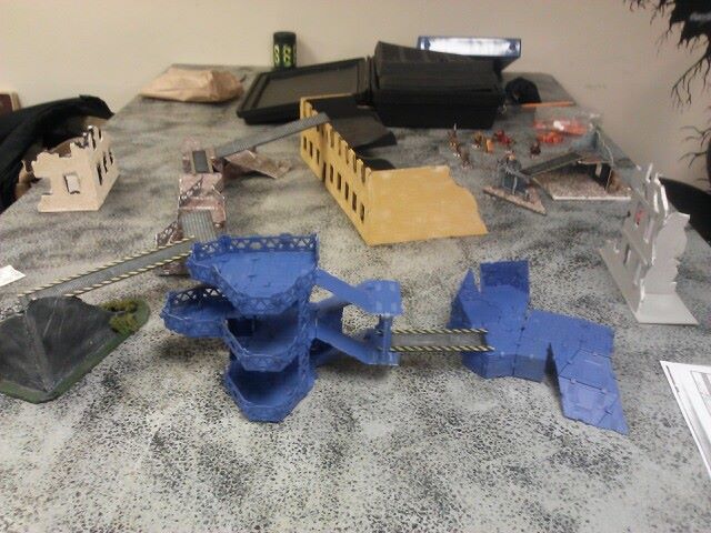 Turn one: For us, it was kind of basic. He ran one of his gangers and a juve to the yellow building and moved along the ramps and hid most of his gang inside the buildings and along the ramps. His heavy with a plasma cannon takes a shot at the juve in cover along the edge, bringing him down but not killing him. On my part of the turn, I put my one heavy in the ruins into overwatch and fire some pot shots at some models I can see, but missing entirely. Ran up my leader and juve to the ruined yellow building. Also hid my other juve and moved up my other heavy and ganger into better position.