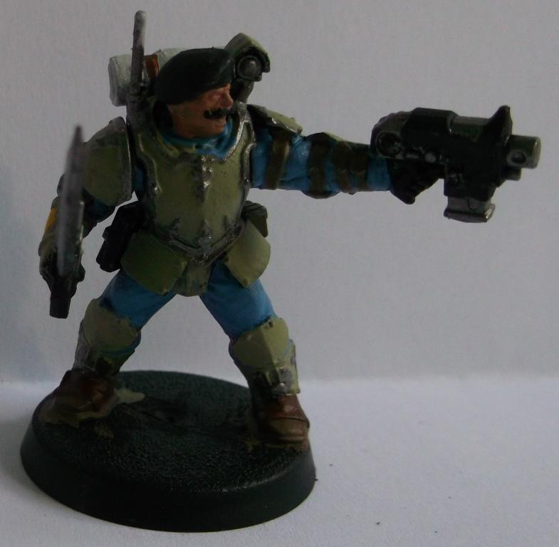 Anyhow, I digress, as I have mentioned a lot of times, I love Storm Troopers, now called Scions, and my favorite and most entertaining unit in my army is a five man 'suicide squad' with melta guns, all converted from regular Cadians. I like the look so much my Tempestuous Command Squad will be made the same way, and I think I'll use the same style of Hellgun for the new guys, saving the hotshots for snipers and other special characters. On the subject of Scions, my Inquisitor has a pair of bolter toting soldiers in blue uniforms that also look pretty cool, therefor I have decided to use the caps and blue color for my Tempestor and new Scions (when they arrive) to give the army a unified look.